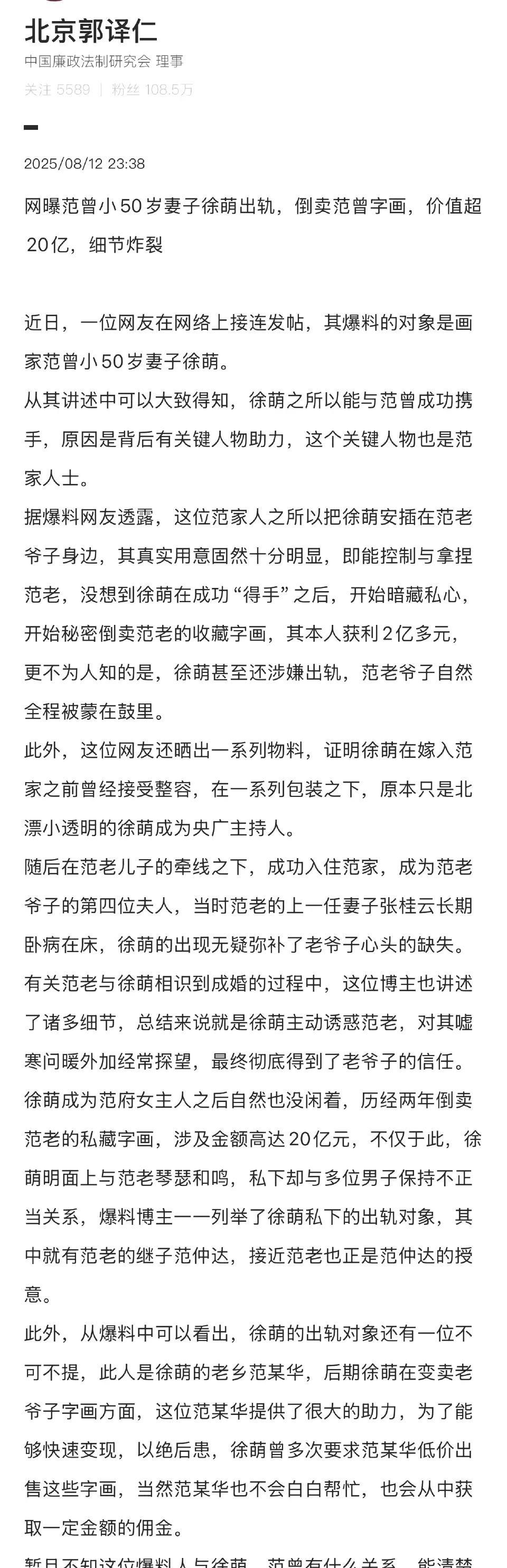 网传87岁的书画家范曾被37岁的娇妻徐萌卷走20亿,这20亿主要是范曾收藏的字画和古董被徐萌私下倒卖的收入,并非直接范曾名下的存款或固定资产。 徐萌是范曾的第4个妻子,范曾是徐萌第2个丈夫,范曾和3个前妻总共有6个孩子,和第1任1个儿子,和第2任1个女儿,第2任和前夫有个女儿,第3任和前夫有2个儿子1个女儿,2个继子2个继女都由范曾抚养,其中2个继子已经改姓范,范曾对这4个继子女视如己出,在与徐萌结婚前已经将婚前财产全部分配给了这6个孩子,而徐萌和前夫有3个孩子,2个女儿1个儿子,目前范曾和徐萌并未有自己的孩子。 有知情者透露,目前范曾因为身体状况不佳,行动疑似已经被徐萌控制,连私人电话也已经打不通。 知情人还透露,徐萌与范曾虽然结婚才1年,但已经出轨多次,私下与多位男子保持不正当关系,其中1位就是范曾的继子范仲达,知情人还说徐萌接近范曾嫁给范曾,就是范仲达一手策划的。 截至发文为止,范曾方面没有任何回应,网传消息不一定为真,一切还是由时间来证明,让子弹先飞一会吧!