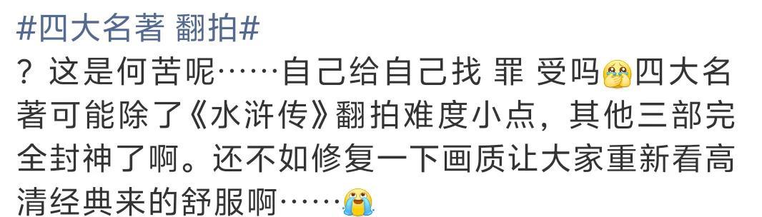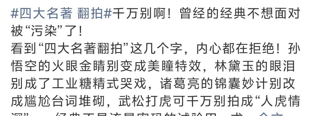 正午阳光负责三国演义 柠萌负责西游记 新丽负责水浒传 郑晓龙公司负责红楼梦 行业深层问题 演员断层:流量明星挤压制作成本,古典剧专业演员稀缺(如梁山好汉需“糙汉”而非“油头粉面”偶像)。 剧本荒:资本“啃老IP”规避创新风险,翻拍被指“黔驴技穷。 创作浮躁:现代剧组“三月拍完”对比老版“数年磨一剑,缺失古典叙事静气。