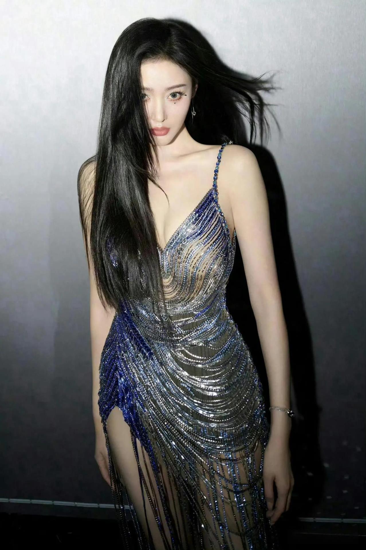 张天爱这身材绝了!蓝银闪钻深V裙开叉到大腿,皮肤白到发光,眼神勾人,随便一摆po