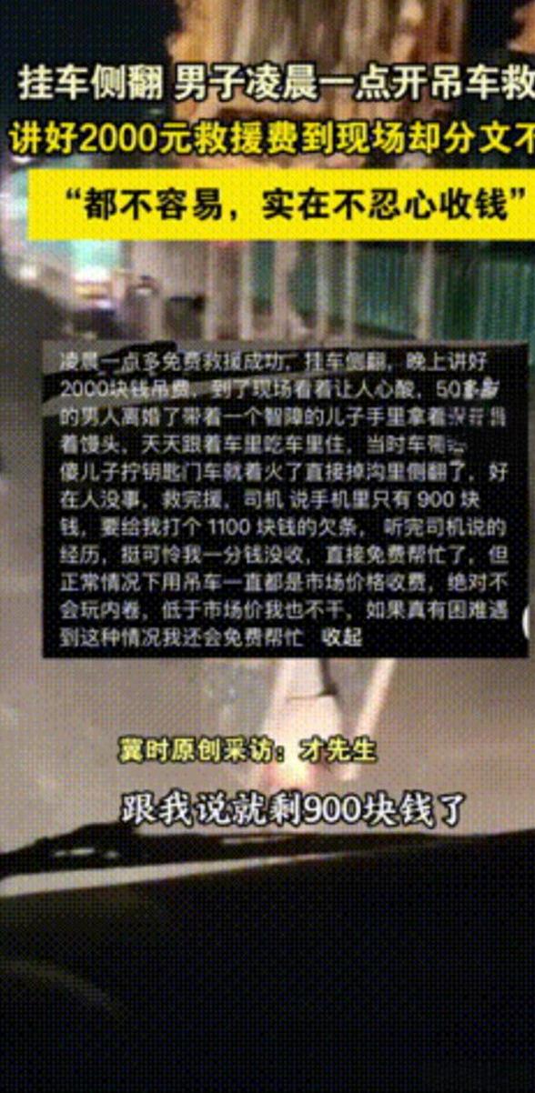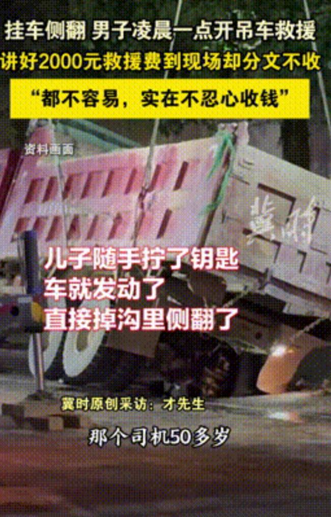 “这个司机大哥火了!”黑龙江牡丹江,一吊车师傅深夜救援侧翻挂车,原本双方讲好2000元的救援费,可到达现场后,他才得知挂车司机儿子的智力有问题,不小心拧了钥匙,这才导致车子侧翻!吊车师傅觉得对方很不容易,于是做出了一个让人意想不到的决定!网友:这才是真正的好人! 事情是凌晨一点多发生的,牡丹江的寒夜冷得刺骨,吊车师傅的电话突然响了,是个挂车司机打来的,声音急得发颤,说车侧翻进沟里了,让他赶紧去救急。 干这行十几年,深夜出车对他来说早成了家常便饭,问清地址两边干脆利落谈好救援费,两千块没多话,就是笔再普通不过的生意。 等他开着吊车赶到现场,借着车灯看清那边的情形,心里那杆秤悄悄就变了,沟里斜斜卡着辆大挂车,旁边蹲着个五十多岁的男人,头发乱蓬蓬的盯着车直发呆,旁边还站着个二十来岁的小伙,眼神有点直看着翻了的车,好像还不明白出了啥大事。 后来才知道蹲在地上的是挂车司机,站着的是他儿子,救援的时候闲聊几句,吊车师傅慢慢拼出了这家人的难处。 司机大哥离异好些年了,一直一个人拉扯儿子,这孩子智力有点缺陷离不开人,他跑长途没法把孩子留家里,就常年把儿子带在身边,驾驶室里堆着被褥和杂物,爷俩吃喝住都在里头,那辆车就是他们移动的家。 这次车翻全是意外,那天凌晨司机停了车,想下车透口气歇会儿,钥匙没来得及拔,儿子在车里无意间伸手一拧,十几吨重的挂车 “哐当” 就滑进了路边的深沟里。 车翻了司机大哥脸都白了,跑运输本就挣的辛苦钱,这下修车得花一大笔,他身上翻遍了也就九百块,往后的日子咋过,他当时估计都不敢想。 吊车师傅干这行久了,也是在方向盘上讨生活的人,哪能看不出这难处,跑长途的车就是饭碗,尤其还带着这么个孩子,肩上的担子重得很。 他没多问,闷头指挥着把车往起吊,吊车 “嗡嗡” 响着,把挂车慢慢从沟里拖了上来,救援倒是按部就班挺顺利。 等车稳稳落回路面,司机大哥红着眼圈攥着那九百块就往他手里塞,说剩下的钱他肯定认,要打张欠条,以后一定补上。 吊车师傅看他那样,摆摆手把钱推了回去说啥也没要,原本谈好的两千块生意,就这么干脆地作罢了。 他没多说啥大道理,可能就是看着那司机和旁边懵懂的孩子,想起了自己跑活儿的不容易,知道这人要是跌进难处里,几百几千块可能就是压垮人的最后一根稻草。 这事后来被人传到网上没成想火了,底下评论刷得老长,有人说 “这师傅心善”,有人说 “换了我未必能做到”,其实他没干啥惊天动地的事,就是少要了一笔该要的钱,可偏偏就是这事,戳中了好多人。 两千块对吊车师傅来说不是小钱,够加不少油,够给家里买些东西,是实实在在的开销,可他瞧见那司机大哥的难处,眼里就不只是这笔生意了,他放弃的是报酬,可透出的那点暖,比啥都实在。 吊车师傅也是这样,他自己淋过跑长途、干重活的雨,见着同行带着孩子陷在泥里,就顺手递了把伞,不是啥了不起的善举,就是 “能帮一把就帮一把” 的实在心思。 现在这事儿还在网上传,好多人记着牡丹江有这么个吊车师傅,他可能没觉得自己做了啥特别的,可就是这桩没做成的生意,让好多人在冷天里心里头热乎了不少,原来就算日子紧巴,就算各有各的难处,人心里那点最真的暖从来都没凉过。 (信息来源:哈尔滨新闻眼)