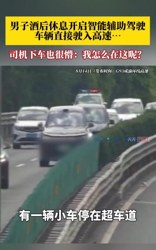 “这下后悔了吧!”7月25日,重庆,一男子午饭期间喝了不少酒,上车后开了车辆的“智能驾驶”功能,随后就闭眼休息了,没想到,车子竟然自动驶入了高速!过了一会儿,男子迷迷糊糊的关闭了智能驾驶,最终车子停在了超车道上。网友:破案了,真是车子的问题! 现在很多车企在卖车时,都会隆重介绍自己的“智能驾驶”功能,夸得天花乱坠,可事实真的是这样吗?生活中不少交通事故都是由“智驾”引发的,这个功能到底靠不靠谱? 这天中午,王先生吃饭时喝了不少酒,随后就上车休息了,他还顺道打开了车子的“智能驾驶”,令所有人没想到的是,车子从停车场驶出后,竟然开到了高速公路上。 而王先生对此毫不知情,车辆行驶了一会儿后,王先生关闭了“智能驾驶”,最终车子停在了最左侧车道上并开启了双闪。 很快,高速就因王先生的违法停车造成了拥堵,一名路过的司机报了警,交警很快就赶来查看情况。 靠近车辆后,交警发现驾驶座上有司机陷入“昏迷”,以为是遇到了什么突发状况,交警立即拍打车窗,好不容易将王先生唤醒后,他也是一脸懵,疑惑自己怎么在高速上? 交警在询问过程中,闻到王先生身上有浓烈的酒气,意识到对方可能喝了酒,便对其做了酒精测试,结果证实他属于醉酒驾驶,被依法带走调查。 智能驾驶并非自动驾驶,司机一定要及时观察路况,这样才能避免交通事故,同时还要牢记:喝酒不能开车! 大家对于这件事是怎么看? 信息来源:《男子酒后开智驾一路昏睡上高速》第1眼网评