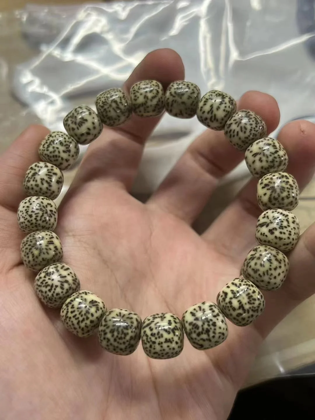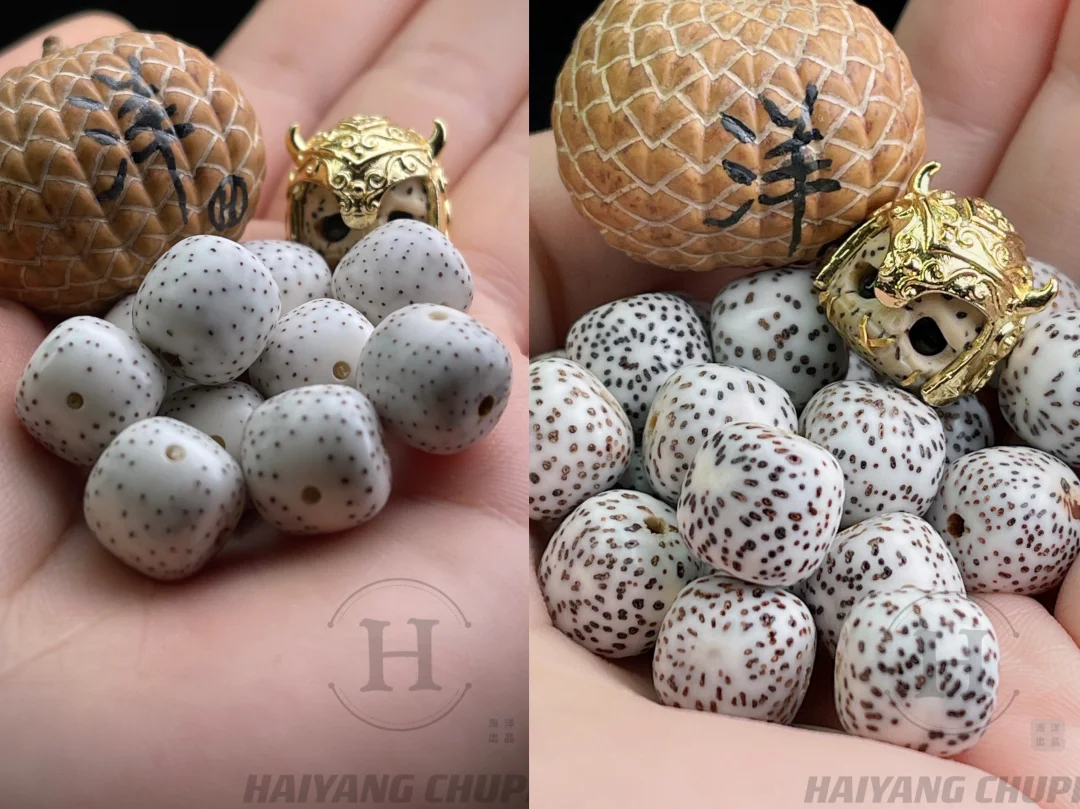 一:“三国料”是文玩圈对东南亚星月菩提主产区的统称,具体为: 1. 老挝:星点粗大且分布稀疏,油性中等,易盘花。 2. 越南:星点细密但连贯性差,部分籽有空洞,密度偏低。 3. 柬埔寨:颜色偏灰白,星点发黑,油性逊于海南料。 (注:缅甸、泰国等产区籽较少,通常也被归入“三国料”范畴。) 二、星点分布差异:海南料更精致 海南料: - 星点细,好的品质星点如针尖,分布均匀且独立,无连星或少连星,呈现“月朗星稀”的清爽感。 - 底色奶白或浅米黄,星点颜色深黑,对比鲜明。 三国料: - 星点粗大(尤以老挝料明显),常呈放射状连星,密集处如“麻子脸”。 好品质的星点也只能达到海南料中等品质星点粗细度! - 星点颜色偏棕红或暗灰,部分籽星眼凹陷,盘玩后易空星藏污。 辨别技巧:强光照射下,海南料表面带油脂星点透光均匀,三国料表面干涩,星点周围常有暗影。 三、油性与手感:海南料胜于千里 1. 油性对比: -海南料:高油密特性显著,指甲刮籽面可见微弱油痕,盘玩3-6个月油润瓷实度高 - 三国料:油性普遍偏低,需长期上手套盘才能追平海南料的初期效果,干手玩家易盘出“柴感”。 2. 手感差异: - 海南料:触感细腻温润,碰撞声清脆如瓷,随着包浆形成会有“糯滑”的果冻质感。 - 三国料:初上手偏干涩,摩擦时有沙沙声,部分低密度籽轻飘飘无压手感。 进阶测试:将未打孔的籽放入水中,海南料秒沉水(密度高),三国料沉水慢还有部分悬浮!