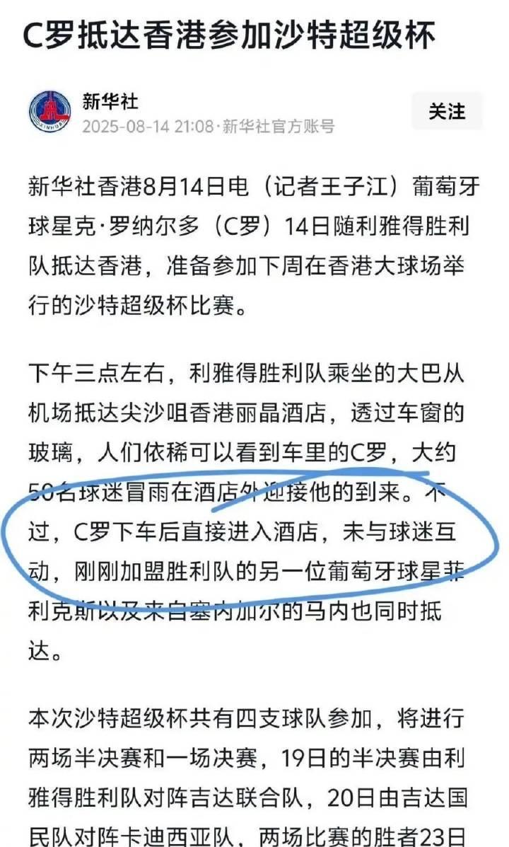 沙特超级杯,在某票务平台上于8月15日14:00公开销售。 到现在,8月16日16点,已经超过了24小时。依旧有很多票没卖完。这完全不是一名超级巨星该有的人气和号召力。 当初梅西北京行,真正的秒空。时间一到,我立马选位子,选来选去总是提示已售出,怎么都抢不到票。几分钟后再回去看,啥都没了。遗憾终身。 离比赛尚有3天,就算还是卖完了,也证明不了他的人气。如果做不到秒空,24小时内也该售罄了。他连这个标准都达不到。 想到新华社报道的只有50名球迷在酒店外迎接C罗的新闻细节,可知C罗所谓的人气全是假的,网络上营销出来的。 不然为什么他在沙特的主场比赛人很少? 正所谓: 地狱空荡荡,魔鬼在人间; 球场空荡荡,罗粉在网上。