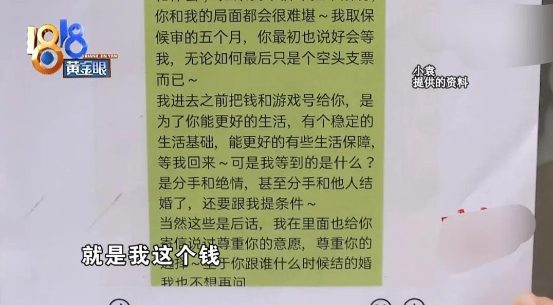 安徽一男子蹲4年监狱,这期间,委托处了8年的女友卖掉游戏装备,卖了25万,加上别的一共37万,都在女友手里。3年后,女友提分手,男子怕女友不给钱,将就就计拿回27万,2025年,男子出来后,想问前女友要回剩余的10万欠款,而前女友回复让他无奈。 1818黄金眼报道,2025年七八月份,90后的小袁从监狱出来了,手里没钱,也没有手机,他在手机店,借了老板电话给前女友小应,问她要钱。 原来,小袁在2020年9月因开赌 场,被判有期徒刑4年,他有一笔钱在前女友小应手里,想要回来。 小袁和小应是在网上认识的,认识两个月两人恋爱同居了。 那时候,日子比较苦,两人一起吃泡面,租房子,小袁看在眼里,疼在心上,那时他对女友发誓,一定要给她过上好日子。 他干过美发师,又做过酒水促销员,每次赚个三头五百的都会转给小应。 小袁记得一件事,那时候小应做前台收银,后来她和老板娘因工资产生争执,不涨工资她就不干了。 小袁为了让小应好好干,特意瞒着她,和老板商量好,自己每月给老板转200块钱,让老板转给小应,假装“涨工资”。 而小应到如今一直都不知道这件事。 后来,小袁犯事进去了,这期间,小应不是家属也不能探视,但小袁和小应一直保持书信来往。 2021年,小袁和小应说起买卖游戏装备的事,小袁想起来自己之前玩了一个游戏,投入不少钱,可以把装备卖掉换钱。 于是,他委托女友小应卖掉游戏装备,小应真给卖了,游戏装备卖了25万,还有一些别的,一共是37万都在小应手里。 却不曾想,小应在2023年和小袁提出分手,她不想再等他了,这对小袁来说无疑是一个很大的打击。 不过,小袁一想到自己的钱还在小应手里,担心要是不同意,这笔钱就可能拿不回来了,那可不行啊,毕竟耽误这4年,自己手里没赚钱,出来也没法生活啊。 想到这些,小袁便答应了小应分手一事,用他的话说,“我就将计就计,说先给我打27万就好了。” 其实,小袁心里是不服的,一开始和小应谈判过,说最多给她五万,可是,自己最后只要回了27万,那时候觉得多一事不如少一事。 但是,小袁出来之后,小应却说你虽然有30多万,但我跟你这么多年,你得给我一部分钱。 不过,小袁心里对小应有不满的想法,他进去之前曾经拜托小应给自己爷爷经常寄一点小礼物,毕竟,老人已经90多岁了。 然而,他出来得知,小应一开始确实看望爷爷了,可是,后面连续几年小应都没有看望老人,小袁心里接受不了。 他觉得提分手的是小应,背叛的也是小应,两人已经分手,这笔钱她不适合拿,所以想要回剩余欠款。 小袁找到记者讲述了自己的遭遇,说了自己的诉求,就是想要回剩余的欠款。 那自然要问一下小应,看她怎么说。 对于30多万放在小应那里这个问题,小应一连说了三个“不是”,并表示,小袁他已经起诉我了,因此就走法律途径好了。 小应不愿多做回应,小袁也只能走法律途径了。 有人说,就算有你说的37万,女方也给你27万了,我感觉这个女方非常好了,一天天的不知道感恩,才10万块钱啊,还要和女方斤斤计较。在一起那么多年不会少花,不过,觉得没必要再要回十几万了,各自安好吧。 也有人说, 小袁说“挣到的钱每个月都大部分给了女朋友”,然后晒出来转账都是300、300、600块的那种,口述每个月给女朋友老板打200块,让给女朋友加工资。口口声声说赚的钱都给女友了,看看你晒的记录有多少?一出来,就赶紧想尽办法的要钱,目的说的挺明确,前女友跑得太慢了,好在是分了。 从法律方面分析,小袁能要回剩余欠款吗? 首先,小袁的游戏装备及出售所得25万元,系小袁在恋爱期间以个人资金投入购买,属于其个人财产。 如果,小袁未明确表示赠与小应,则不属于小应。 小应以恋爱多年为由,要求小袁给一部分补偿,合理吗? 《民法典》第985条规定:得利人没有法律根据取得不当利益的,受损失的人可以请求得利人返还取得的利益。 其次,小应占有37万元无法律或合同依据(非赠与、非共同财产),且小袁因此遭受财产损失,符合不当得利要件。 小应主张“恋爱补偿”无法律依据,恋爱关系中的情感付出不属于法律保护的权益范畴。 小袁表示,一开始已同意小应保留5万元(实际返还27万),可视为对小应的自愿补偿。 但如果小应进一步要求分割剩余款项,小袁有权以“不当得利”为由要求全额返还剩余10万元。 但是,小袁需证明37万元的来源,如游戏充值记录、出售合同,及委托关系,如书面委托或聊天记录,以排除赠与可能。 有人觉得,小袁这么做不地道,前女友跟了他8年,他进去也等了一段时间,小袁出来就要钱,剩余10万不该往回要了,你怎么看呢? 关注@福康说法 从日常点滴学法律,生活安稳更有底