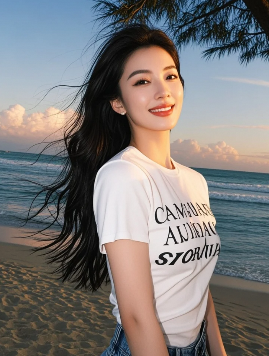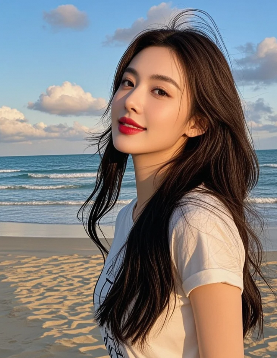 在落日熔金的时刻,她以长发为笔,沙滩为纸,书写着星光熠熠的亲和篇章