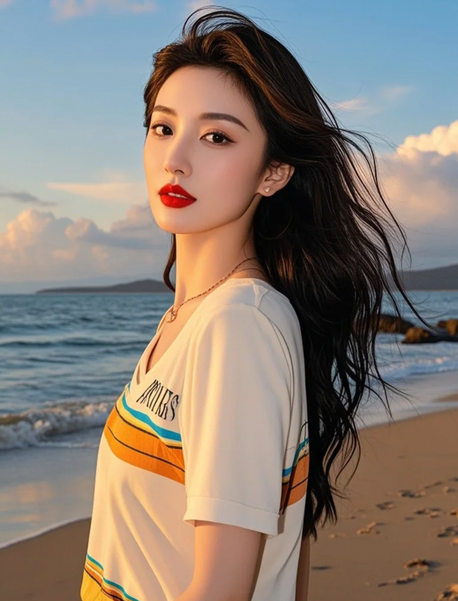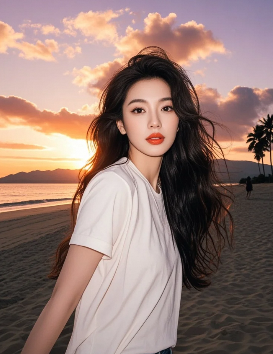 白云悠悠,她自在前行,T恤与长发在夕阳下,勾勒出活力四射的星之轮廓