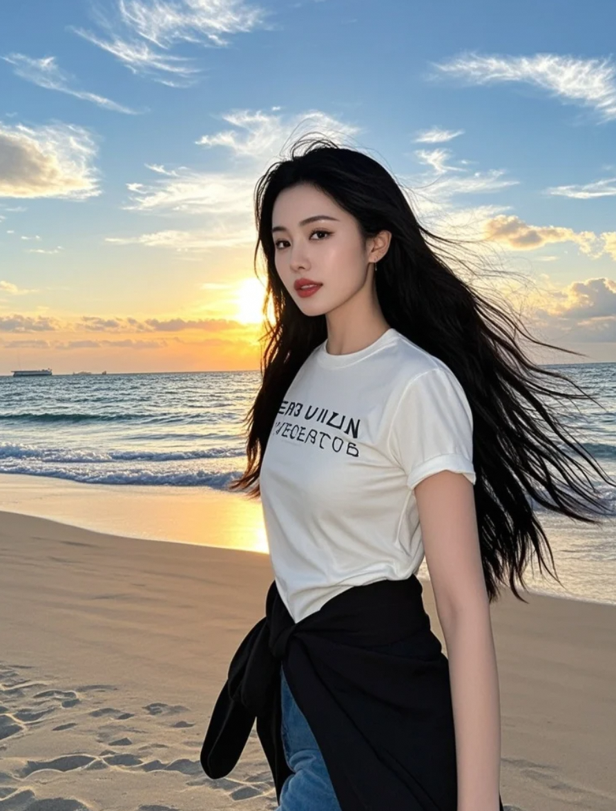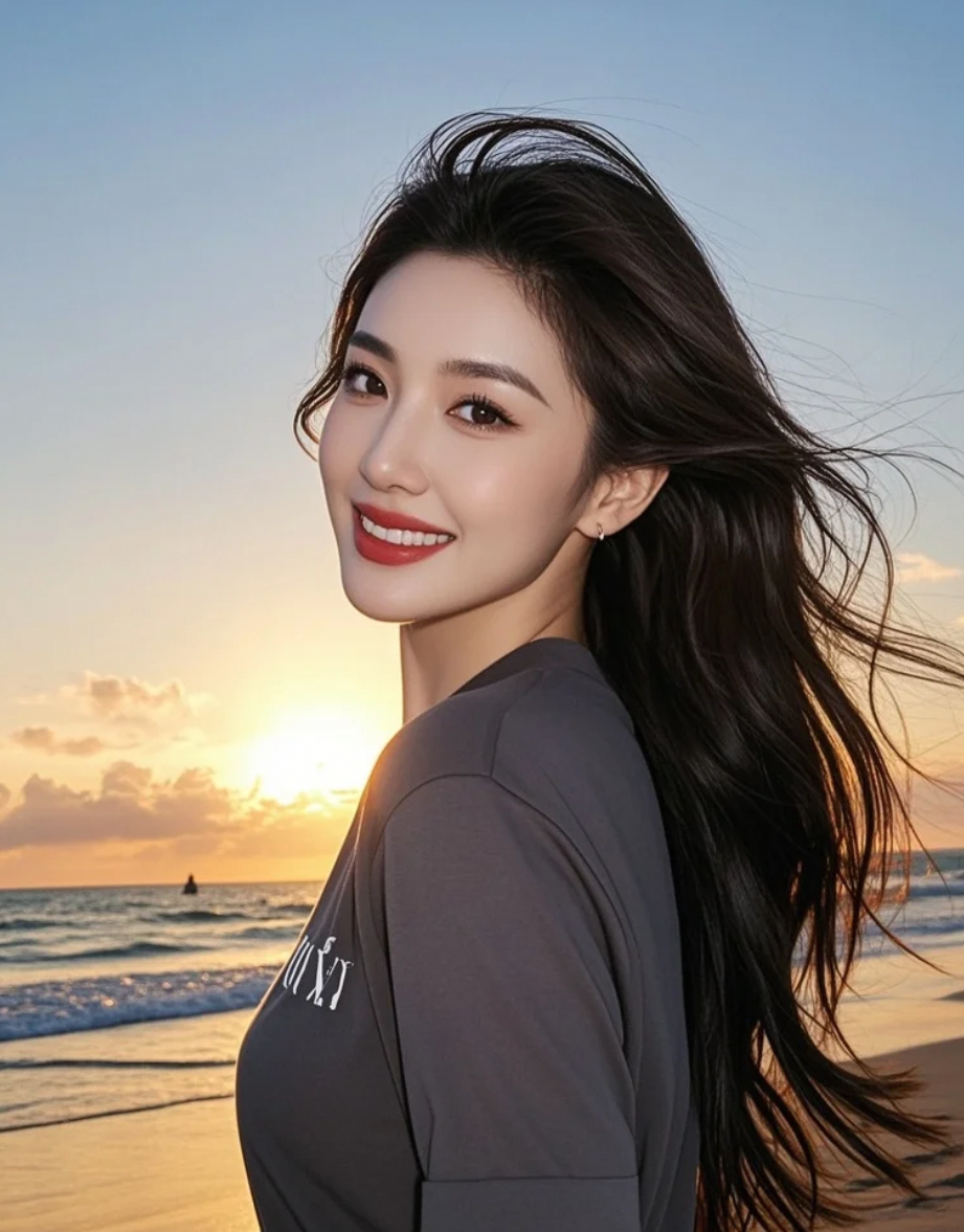 她的身影与晚霞交融,长发飘飘,是海风中最动人的阳光亲和巨星画面