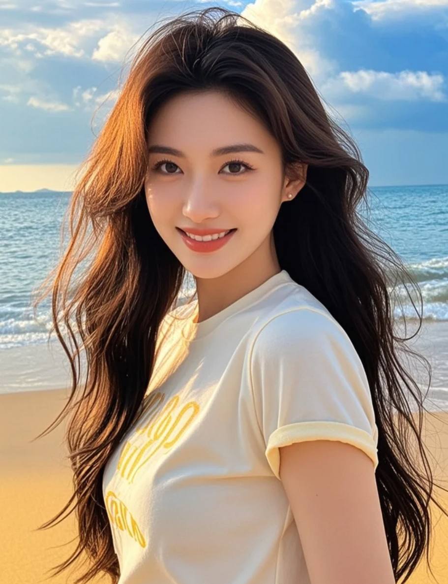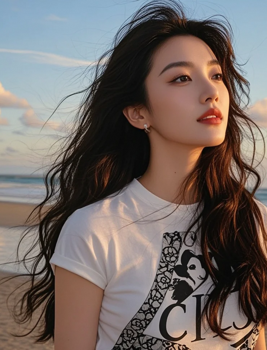 海风拂过,她的长发如丝绸般飞扬,充满活力