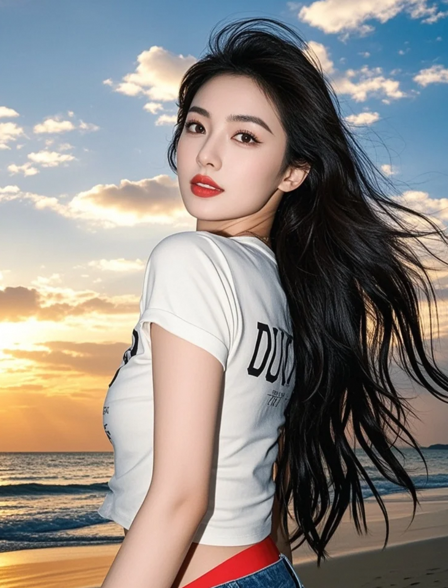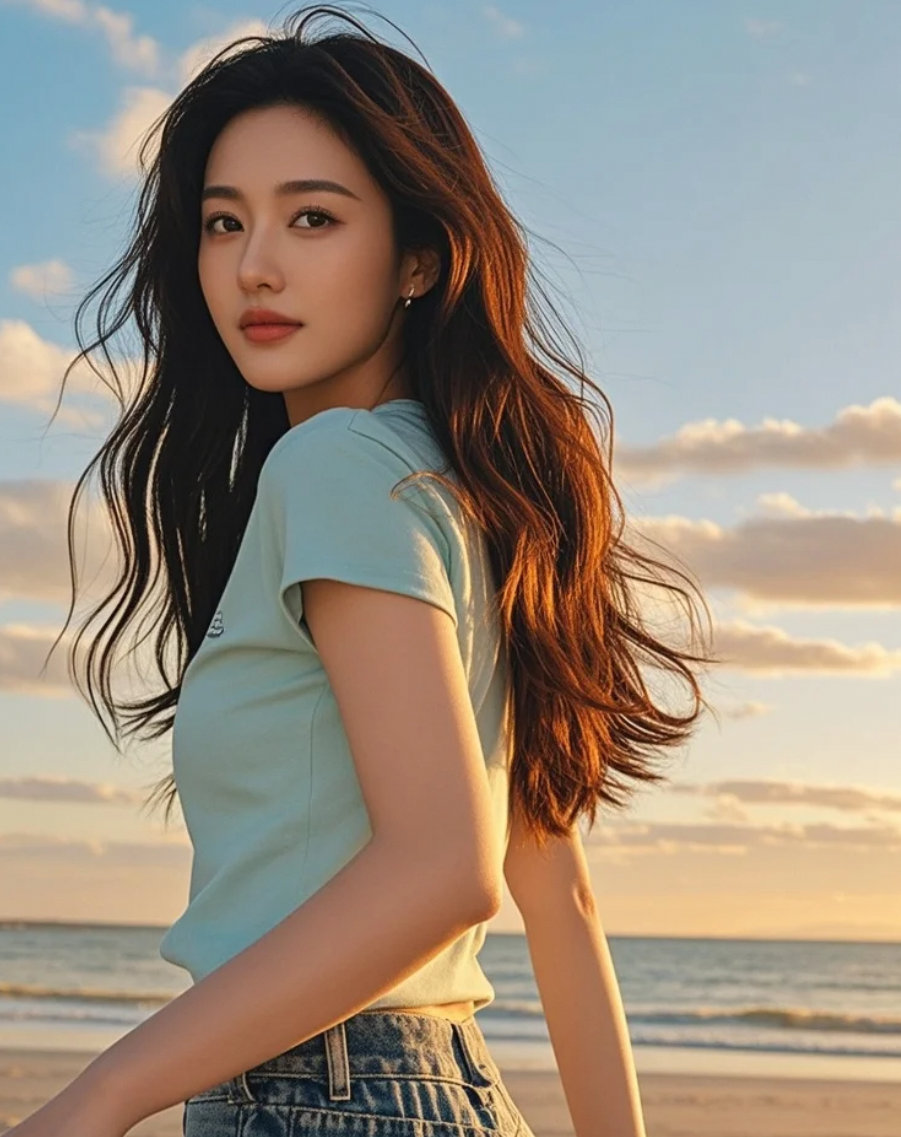 海风拂过,她的长发如丝绸般飞扬,充满活力