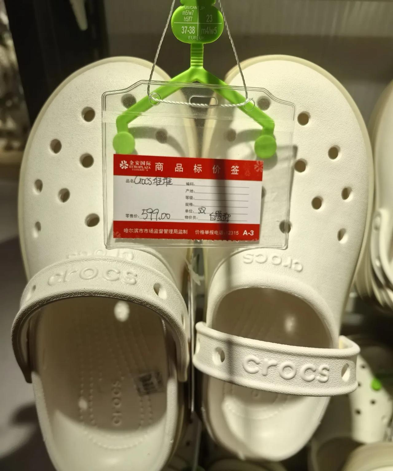 洞洞鞋竟然卖700多一双?哈尔滨中央大街某购物广场一个洞洞鞋专柜,这玩意儿竟然卖这么贵呀,599, 699、799。我觉得洞洞鞋就应该是几十块钱的东西呀。可能人家用的这个材料比较好。 我默默的看了看脚底下,我的这双洞洞拖鞋才15块钱,在哈尔滨透笼街买的。这些天一直穿,可喜欢了,特别舒服。我昨天想再去买一双,可惜没有码了,全是40号的了。在杭州的时候也是,夏天基本上一双洞洞鞋就搞定了。 我舍得花几百块钱买一双正装皮鞋,可我舍不得花同样的钱买一双拖鞋。但既然能在中央大街这儿开专柜,看来还是有消费群体的。很小的一个柜台竟然有四个营业员。 回来一查竟然是个国外品牌,怪不得呢,据说还出过9999元一个联名款。太夸张了吧。 你觉得这个价钱怎么样,你会花六七百块钱买一双拖鞋吗?