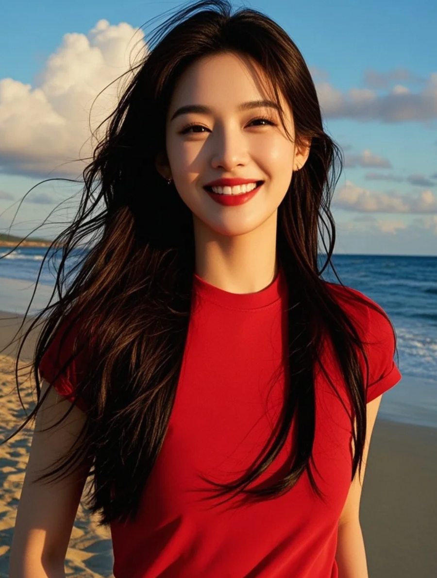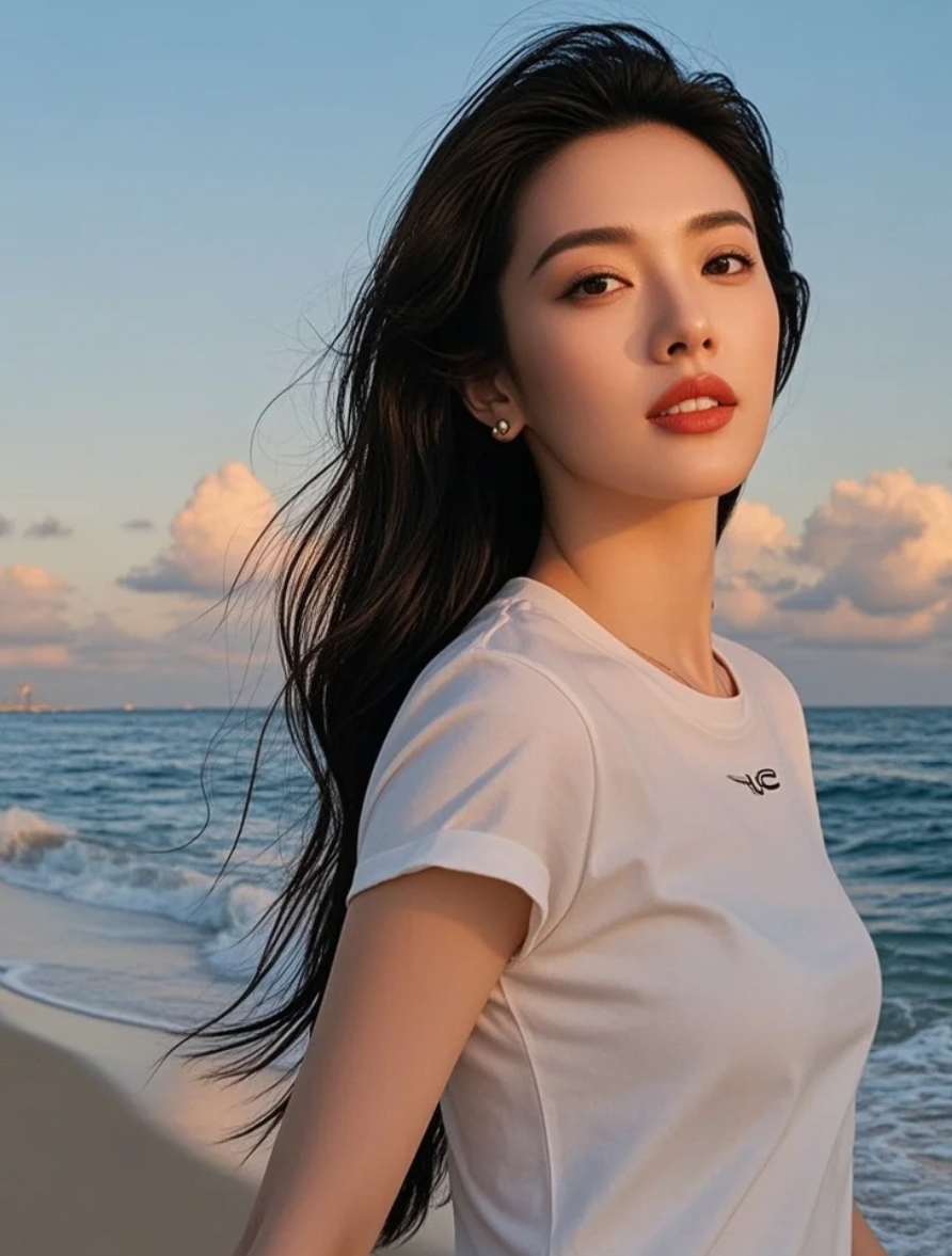蓝天为幕,白云作伴,她身着简约T恤,以亲和笑容点亮了整片金色海岸线
