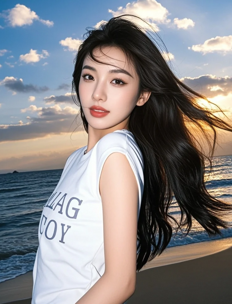 在落日熔金的时刻,她以长发为笔,沙滩为纸,书写着星光熠熠的亲和篇章