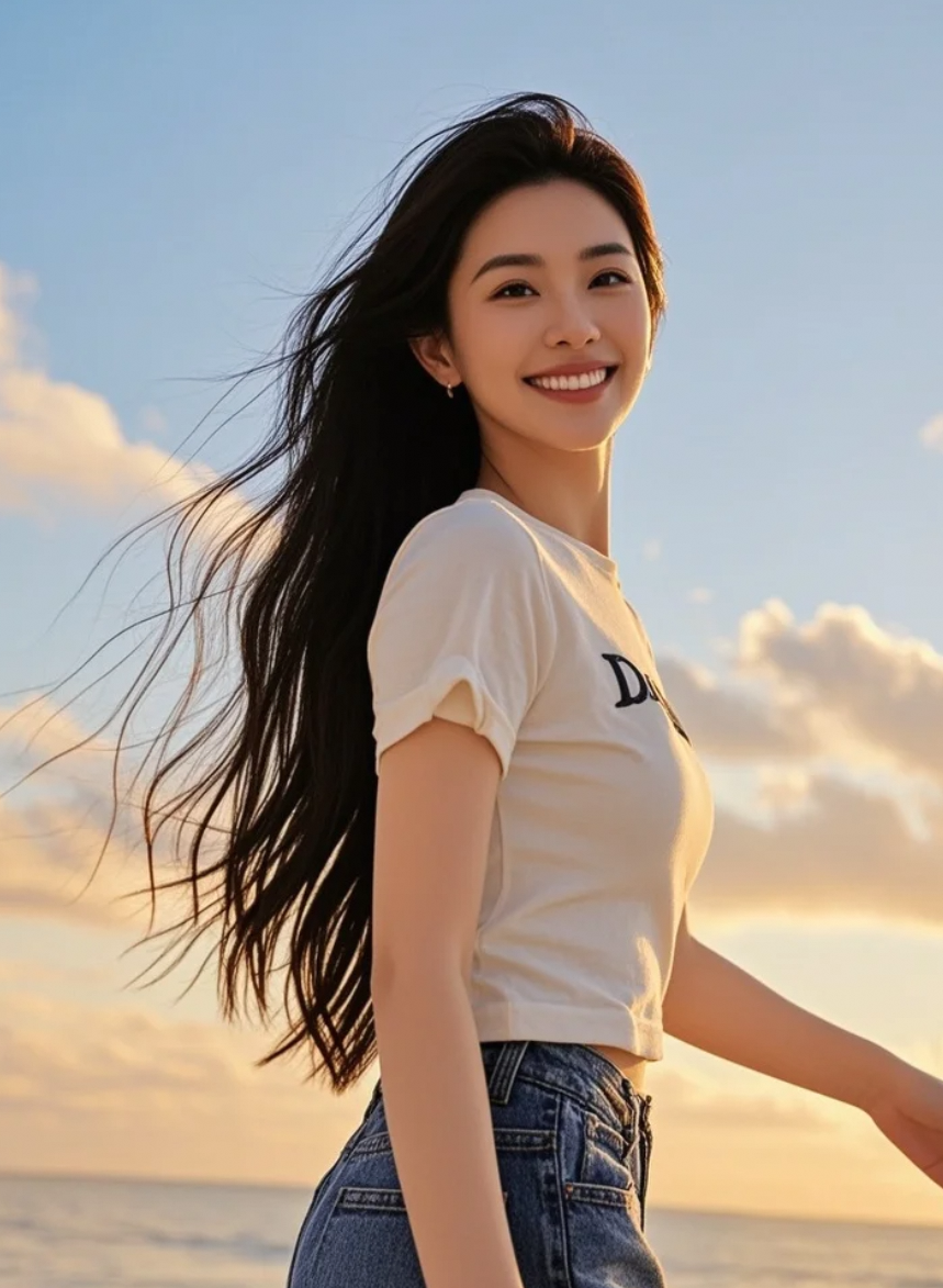 她的身影与晚霞交融,长发飘飘,是海风中最动人的阳光亲和巨星画面