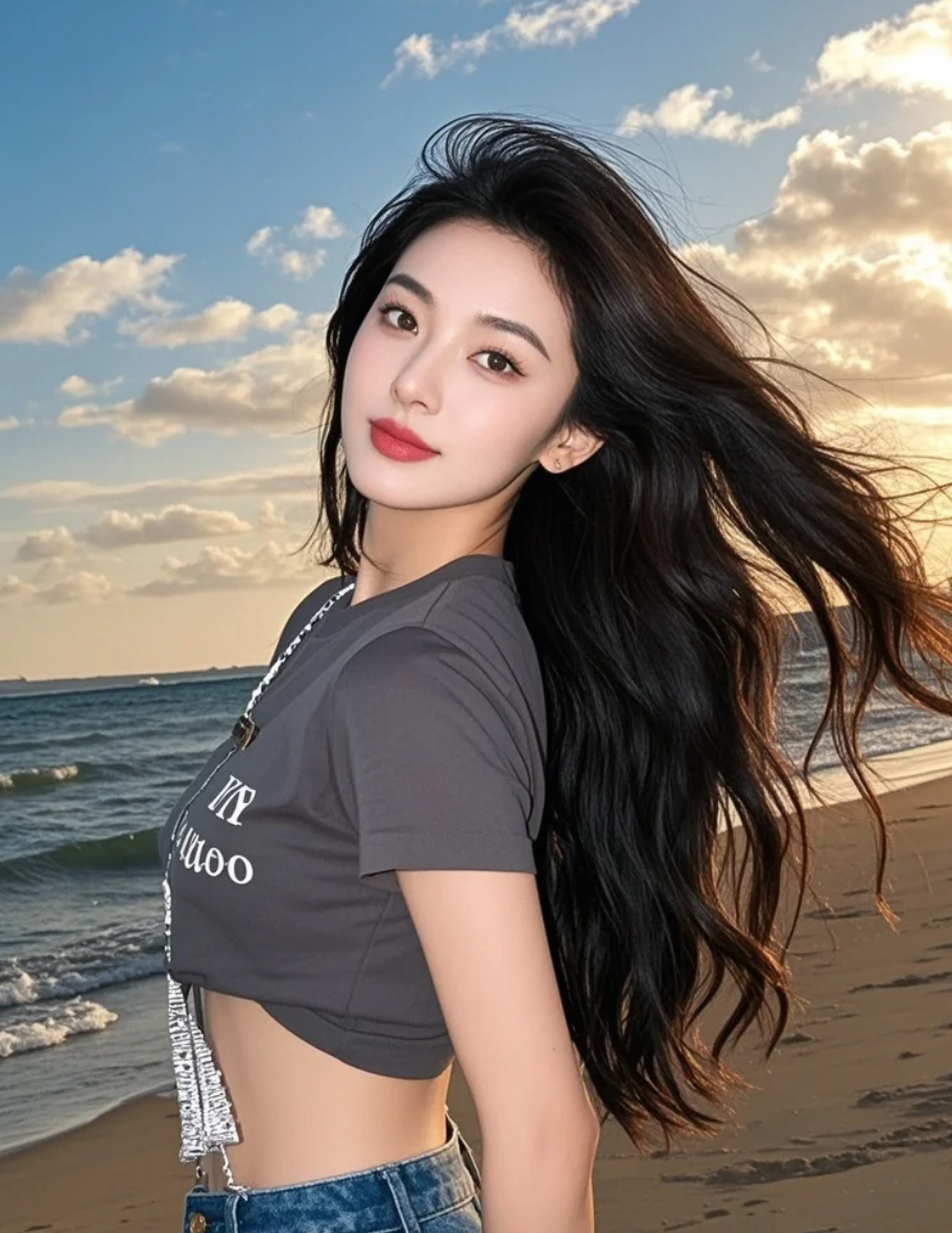 她漫步在夕阳沙滩,长发与云影共舞,明艳妆容映衬出大牌明星的风采