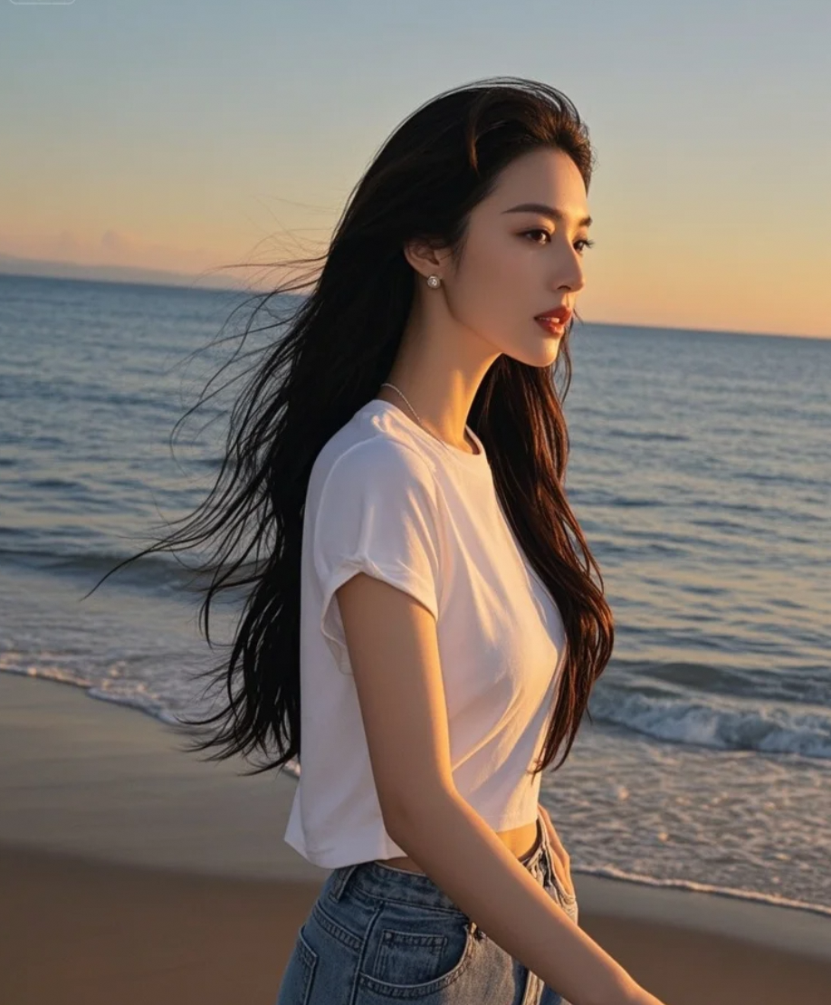 她的身影与晚霞交融,长发飘飘,是海风中最动人的阳光亲和巨星画面