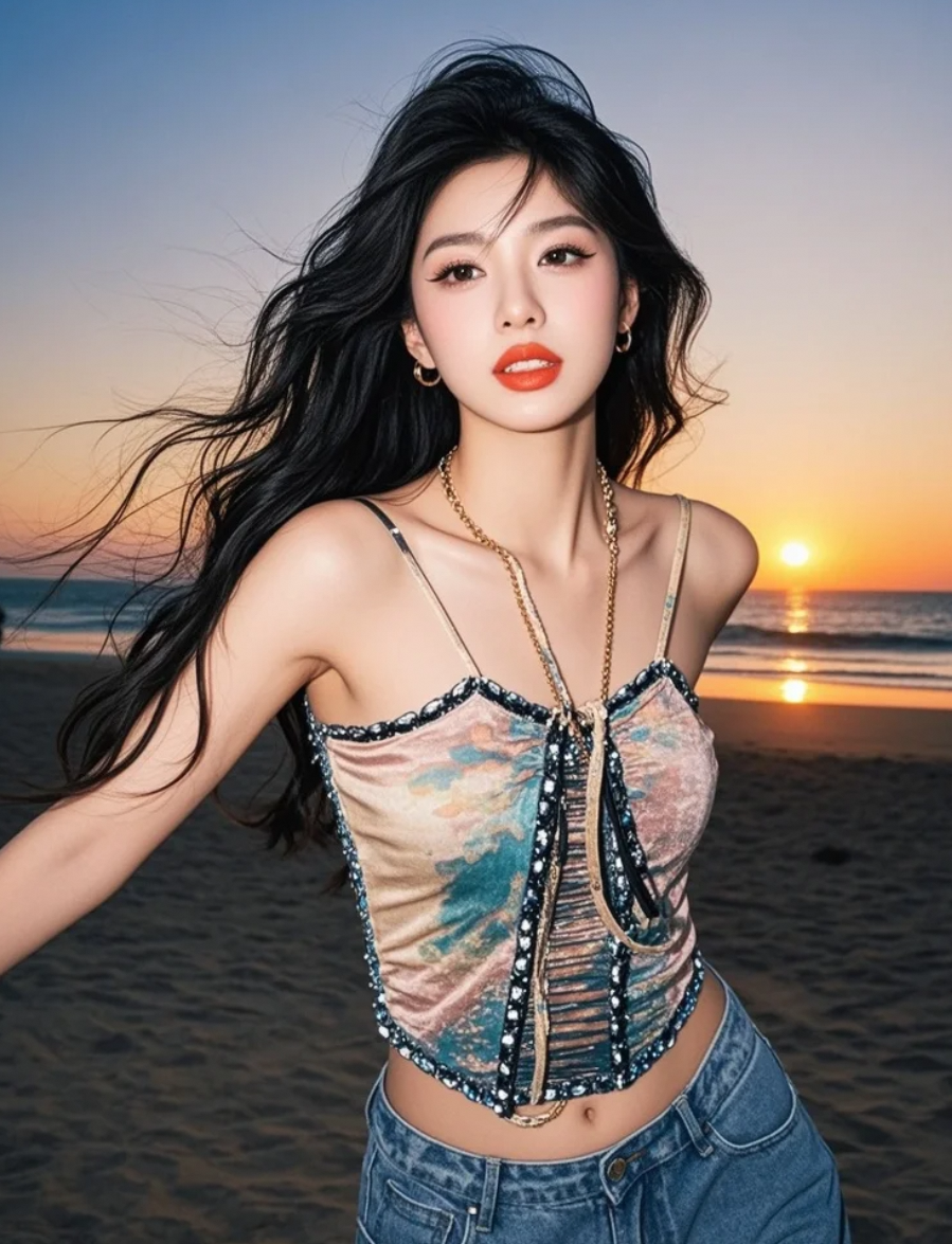 她的身影与晚霞交融,长发飘飘,是海风中最动人的阳光亲和巨星画面