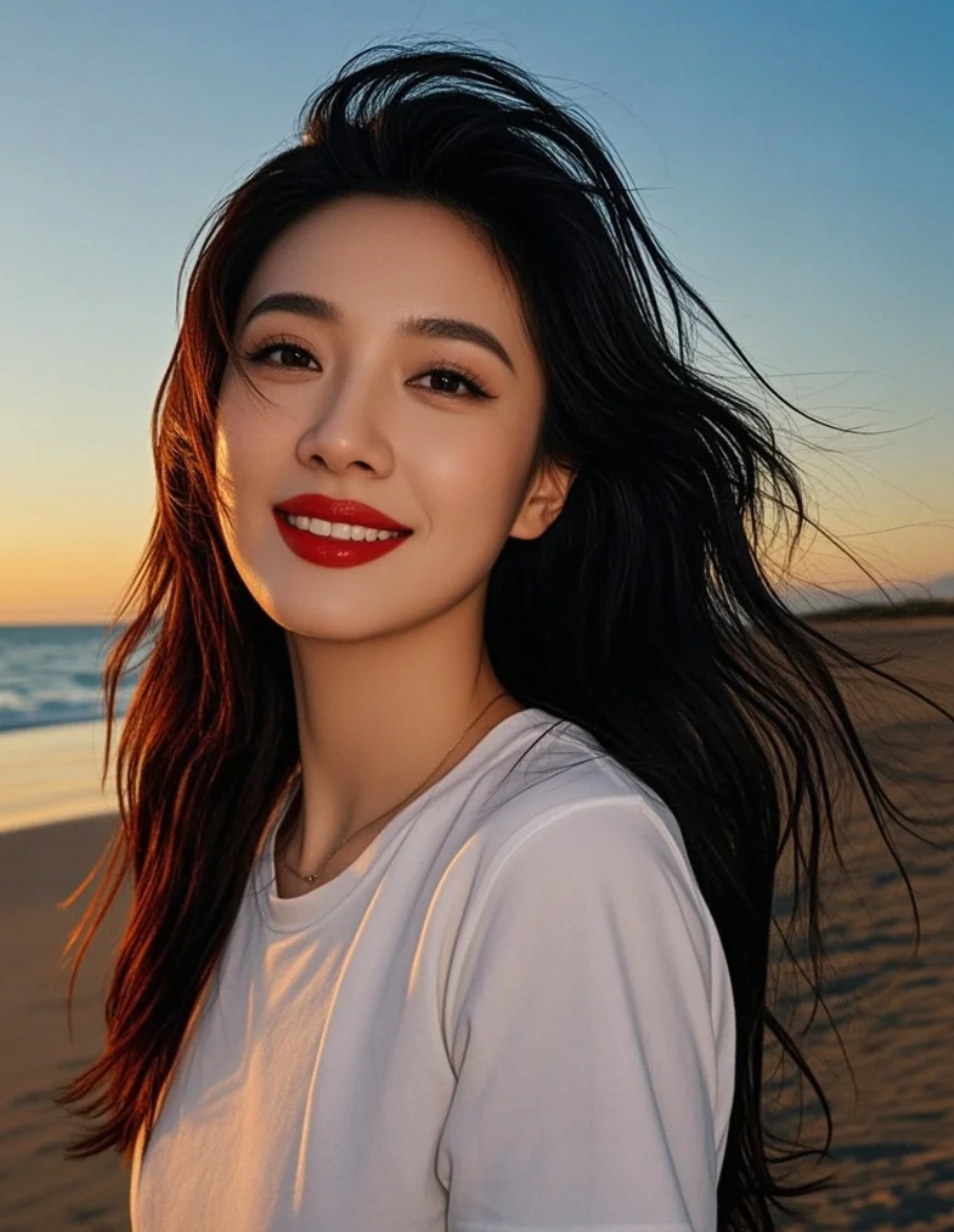 她漫步在海天之间,长发与云影共舞,明艳唇色点亮了黄昏的静谧时光