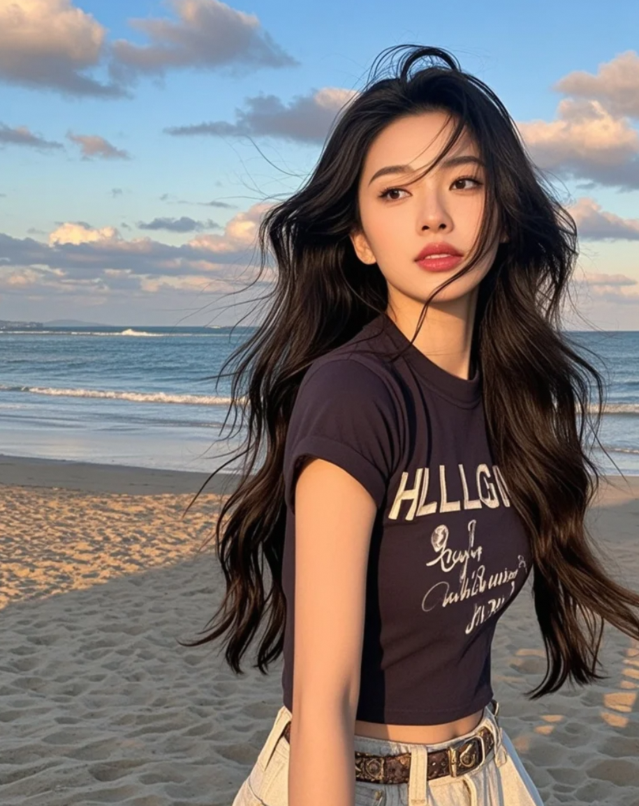她赤脚踩在沙滩上,发丝随海风飘扬