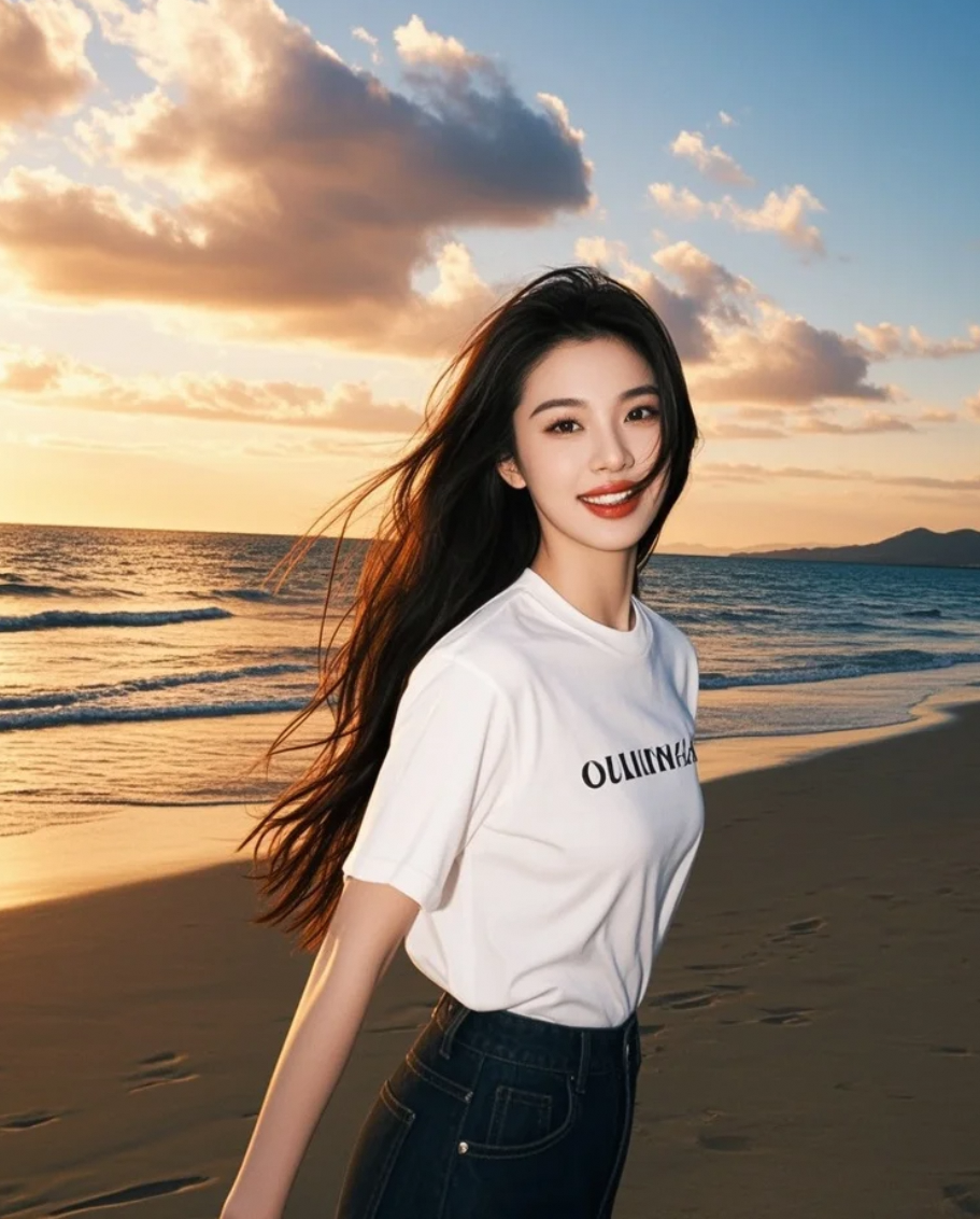海风掀起她的衣角,发丝如泼墨般在橙红的天幕上挥洒