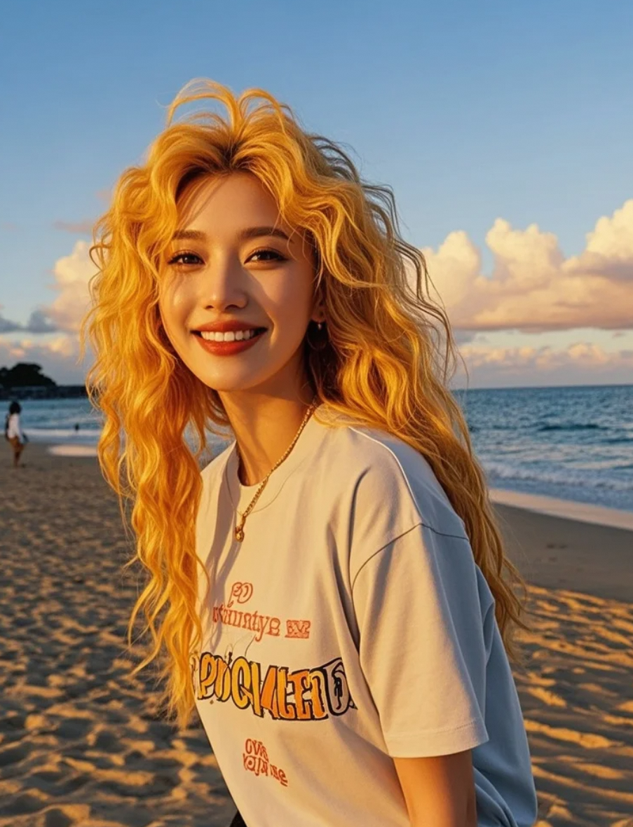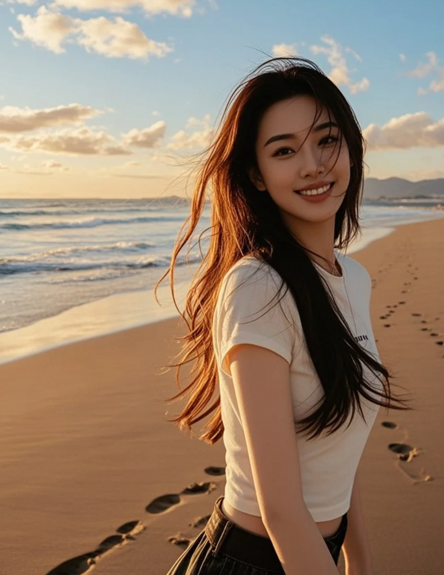 浪花在脚边碎成珍珠,她的发梢沾着细碎的金色阳光