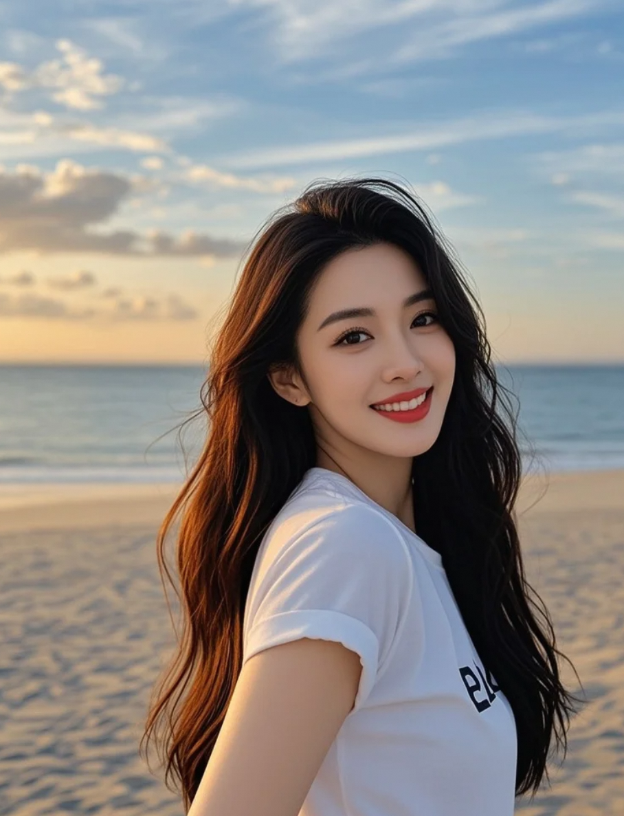 海风掀起她的衣角,发丝如泼墨般在橙红的天幕上挥洒