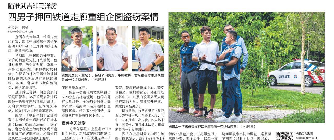 “丢人丢到国外!”四个贵州人飞去新加坡作案,他们事先做好“攻略”,知道机场入境难度大,很可能就地遣返,于是他们就先去马来西亚,几天后再从陆地关口入境新加坡,这样看上去像“新马几日游小型旅游团”。他们目标明确,直奔新加坡富人区。 这地方是武吉知马的绿叶坊一带,洋房密集,不少住户身价上亿。他们踩点时鬼鬼祟祟,东张西望,很快引起周边居民警觉,有人直接报警。 警方当晚在铁道走廊巡逻时,发现几人往丛林跑,立刻调集多部门力量围捕。不到24小时,四人全被抓获,两人在丛林落网,一人在金文泰商场附近被抓,最后一个在芽笼酒店被逮。 他们年龄在36到41岁之间,持社交访问准证入境,身上搜出螺丝刀、扳手等作案工具,还有400多新元现金和马币。警方怀疑他们涉及今年4月到7月的至少三起破门行窃案,其中两起盗走财物超6万新元。 新加坡对这类犯罪向来零容忍,破门行窃罪成可判监10年。这次四人被控共谋持有作案工具,若罪成最高可判两年监禁并罚款。 当地早已加强防范,去年就在私宅区增设流动监控。这次快速破案,也得益于警方跨部门协作和无人机配合。偷盗团伙想钻边境空子,结果刚入境就落网。 这不是武吉知马第一次出事。去年6月到8月,这一带就发生过10起类似案件,一个中国团伙三人落网,14人逃了。今年5月,还有三名拉美男子在这作案被抓。 警方数据显示,新加坡破门行窃案2023年有135起,比前一年回升。虽然总数不算高,但富人区接连被盯上,影响恶劣,必须严打。 这些团伙往往流窜作案,利用地理便利跨境进出。从马来西亚陆路入境相对宽松,成了他们常用的路线。这次四人就是从兀兰关卡进来,自以为能蒙混过关。 他们计划得很细,先在马来西亚待几天,再以游客身份入境,看起来就像普通旅行团。可惜他们低估了新加坡的治安网络,居民警惕性高,警民联动快。 金文泰警署署长周利玲透露,警方4月起就接到报案,发现同一区域多次被盗。作案者通常利用铁道走廊的丛林作掩护,得手后迅速撤离。 这次行动正是基于前期情报展开的针对性部署。巡逻警员发现异常后,立即启动应急机制,调动辜加警队、特别行动指挥中心和无人机部队协同作战。 无人机在夜间搜捕中发挥了关键作用,能快速覆盖大片丛林区域。地面警力则封锁出口,形成合围,让逃犯无处可藏。 四人落网后,警方在他们住处和随身物品中起获多套换洗衣物,明显是为长期作案准备的。他们可能还打算继续踩点,伺机下手。 新加坡法律严格,一旦定罪,不仅坐牢罚款,照片也不会打马赛克,直接公开示众。这种社会性惩罚,对犯罪分子是巨大震慑。 武吉知马作为顶级富人区,安保本就不低,近年更是加装摄像头,巡逻频次也提高了。可只要有漏洞,就会被盯上。 这起案件再次提醒,再富的区也挡不住贪婪的心,但只要警民合作紧密,再狡猾的贼也逃不过法网。 犯罪团伙总以为能钻空子,却忘了新加坡执法效率极高。从入境到落网不到24小时,堪称精准打击的范例。 说到底,想靠偷盗发财,路走窄了。这四人不远千里跑来作案,结果连目标房子的门都没摸到,就被一锅端了。