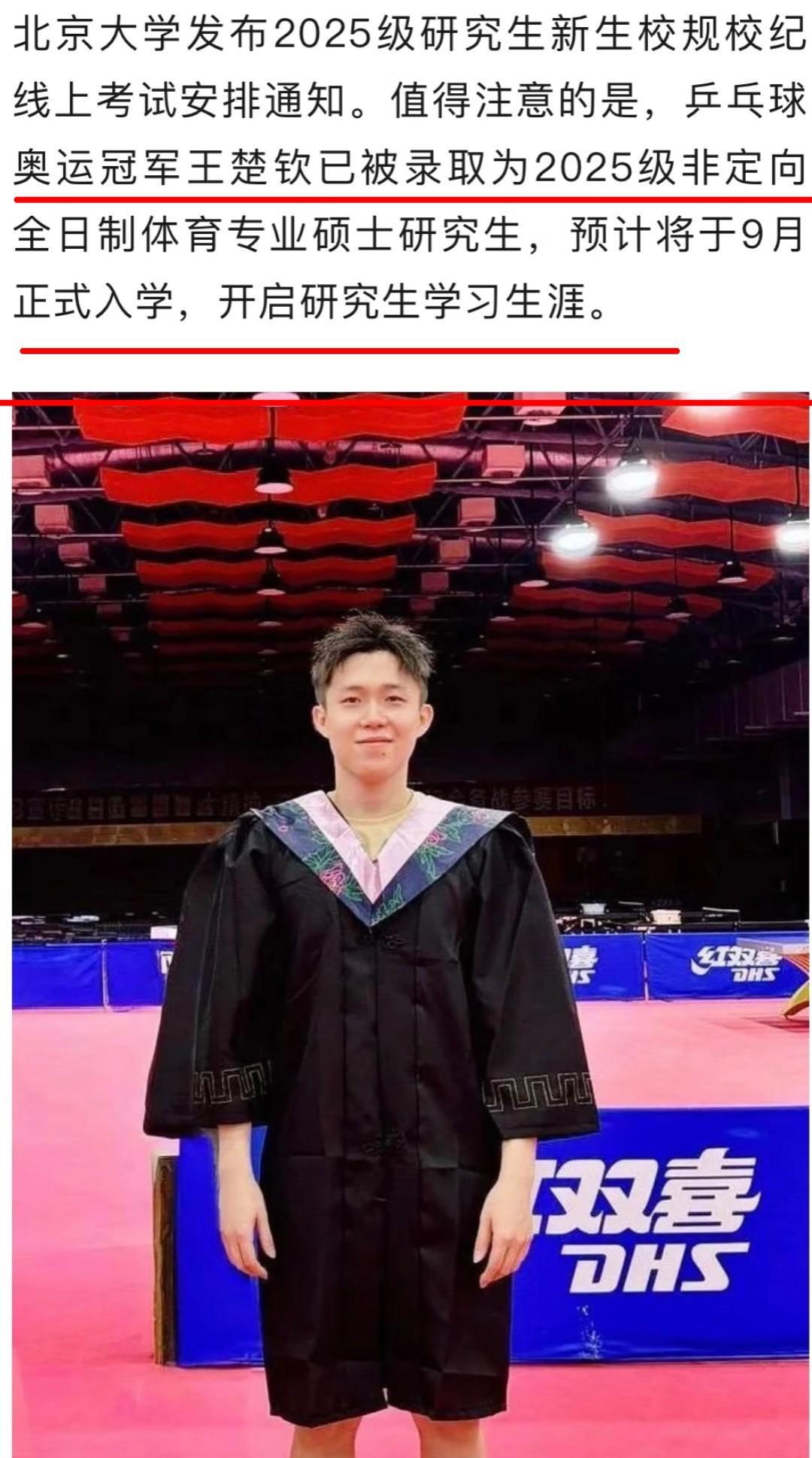 刷到王楚钦的北大复试成绩,瞬间被戳中——这才是真正的“追光者”吧! 真心想跟大家说:天赋或许是少数人的幸运,颜值也未必人人都有,但那颗不肯躺平,一路向上较劲的心,才是普通人最该握紧的“通关秘籍”。 王楚钦能在如此繁忙的日程里还通过北大复试,足见他的自律和坚韧。很多人在单一任务面前都会懈怠,而他却能多线作战,这份毅力非常人能及。 在高强度的训练和商务活动中,他还能挤出时间复习专业知识和写论文,这不仅是时间管理的胜利,更是他对知识的渴望和对未来的规划。 其他学生为复试焦头烂额,而他却能轻松上岸,这差距背后是他日复一日的努力。这也给广大学生提了个醒,成功没有捷径,只有付出才有回报。 王楚钦就像一颗闪耀的星星,在自己的领域发光发热。他用行动证明,只要有目标并为之奋斗,就能实现梦想。他是众多学子学习的榜样。