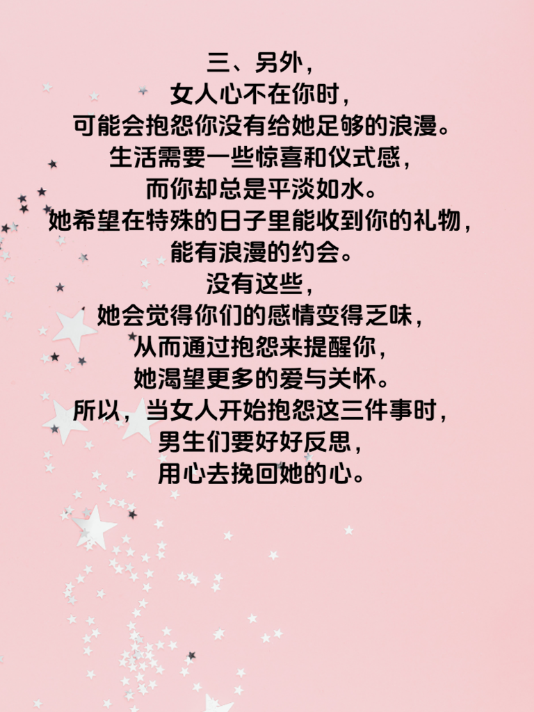 一、女人心不在你时,常常会抱怨你不够懂她。她会觉得你总是忽略她内心的感受,不明白她真正想要表达的是什么。比如,她精心挑选了一件新衣服,满心期待你的夸赞,可你却毫无反应,或者只是敷衍几句。这时候,她的抱怨就会随之而来,觉得你根本不关心她的喜好,不重视她这个人。 二、她还会抱怨你陪伴她的时间太少。在她需要你在身边的时候,你却总是忙于工作或者其他事情。她渴望和你一起度过那些温馨的时光,一起吃饭、看电影、散步。当你总是缺席,她心中的不满就会积累,通过抱怨表现出来,认为你没有把她放在重要的位置。 三、另外,女人心不在你时,可能会抱怨你没有给她足够的浪漫。生活需要一些惊喜和仪式感,而你却总是平淡如水。她希望在特殊的日子里能收到你的礼物,能有浪漫的约会。没有这些,她会觉得你们的感情变得乏味,从而通过抱怨来提醒你,她渴望更多的爱与关怀。所以,当女人开始抱怨这三件事时,男生们要好好反思,用心去挽回她的心。