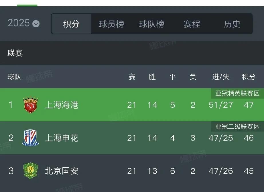 闷声发大财!不知不觉,不被大家看好的上赛季冠军上海海港悄悄来到了中超联赛积分榜第一的位置,暂时领先排名第二的上海申花1分。 上海申花客场0:0艰难战平浙江队,积46分排名第二,此前积累的6分优势,瞬间化为乌有;排名第四的北京国安凭借法比奥的神勇发挥,3:1战胜青岛西海岸积45分,暂时来到了积分榜第三的位置。而成都蓉城留力打足协杯半决赛,轮换主力的情况下,暂时0:0和青岛海牛战平。 本赛季中超联赛积分犬牙交错,加上成都蓉城和北京国安三线作战,上海申花状态不好,感觉上海海港有乱中取胜卫冕的可能性。