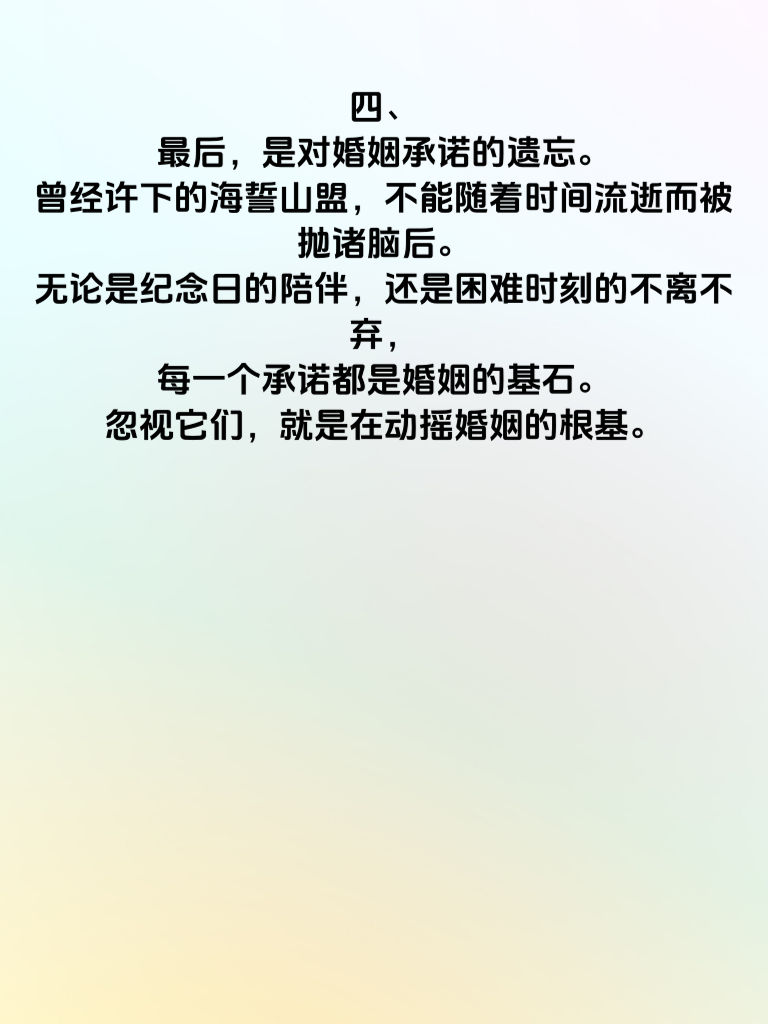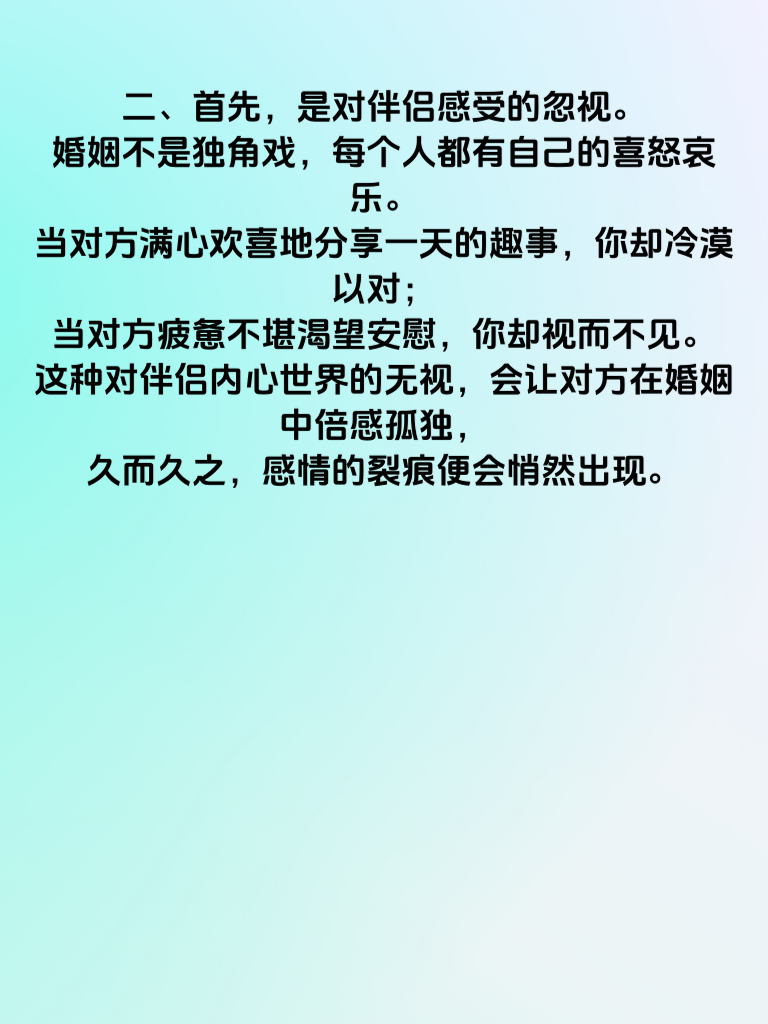 一、在婚姻这座围城里,有些事看似平常,却暗藏着对感情的考验。忽视这三件事,无异于给婚姻埋下了背叛的隐患。 二、首先,是对伴侣感受的忽视。婚姻不是独角戏,每个人都有自己的喜怒哀乐。当对方满心欢喜地分享一天的趣事,你却冷漠以对;当对方疲惫不堪渴望安慰,你却视而不见。这种对伴侣内心世界的无视,会让对方在婚姻中倍感孤独,久而久之,感情的裂痕便会悄然出现。 三、其次,是对家庭责任的逃避。婚姻意味着共同承担,柴米油盐、养育子女、照顾老人,这些都是生活赋予我们的责任。若一方总是逃避,把所有担子都扔给另一方,不仅会让对方身心俱疲,更会让婚姻的天平失衡。 四、最后,是对婚姻承诺的遗忘。曾经许下的海誓山盟,不能随着时间流逝而被抛诸脑后。无论是纪念日的陪伴,还是困难时刻的不离不弃,每一个承诺都是婚姻的基石。忽视它们,就是在动摇婚姻的根基。 五、婚姻需要用心去经营,莫让忽视成为背叛的利刃。珍视这三件事,才能让婚姻在岁月中绽放出持久的幸福光彩。