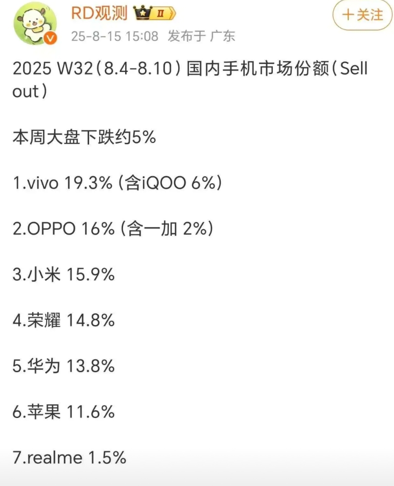 没什么好说的,华为老早就知道了,原生鸿蒙跟销量挂钩,一时的低迷也正常。W32国内手机销量排行榜一出,整个市场都炸锅了,又是vivo霸榜,19.3%甩开同行十几条街道,可怜的苹果,只能排第六了,这回真的的一蹶不振了。