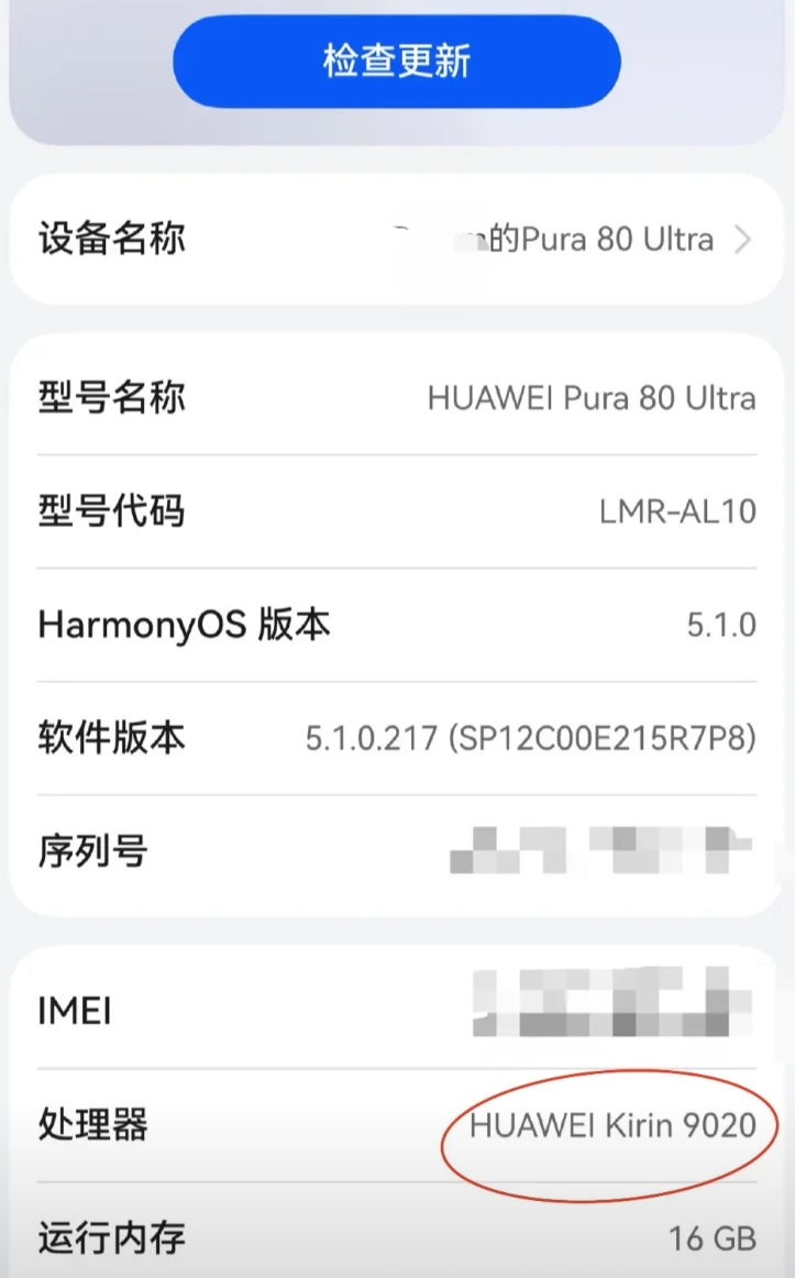 华为Pura80系列升级最新鸿蒙5.1系统之后,设置中显示“麒麟9020”处理器,这是华为自2021年后首次恢复公布型号。