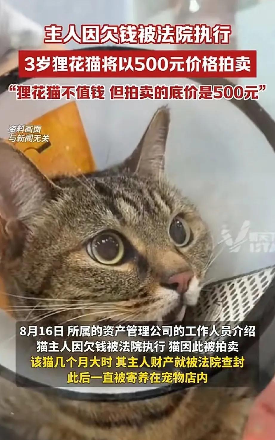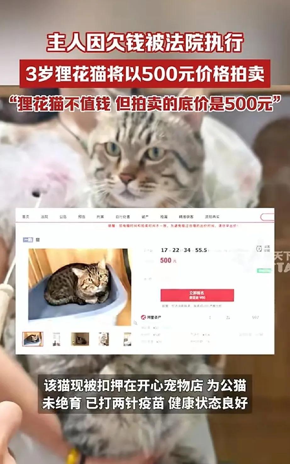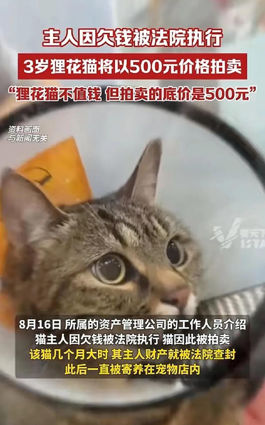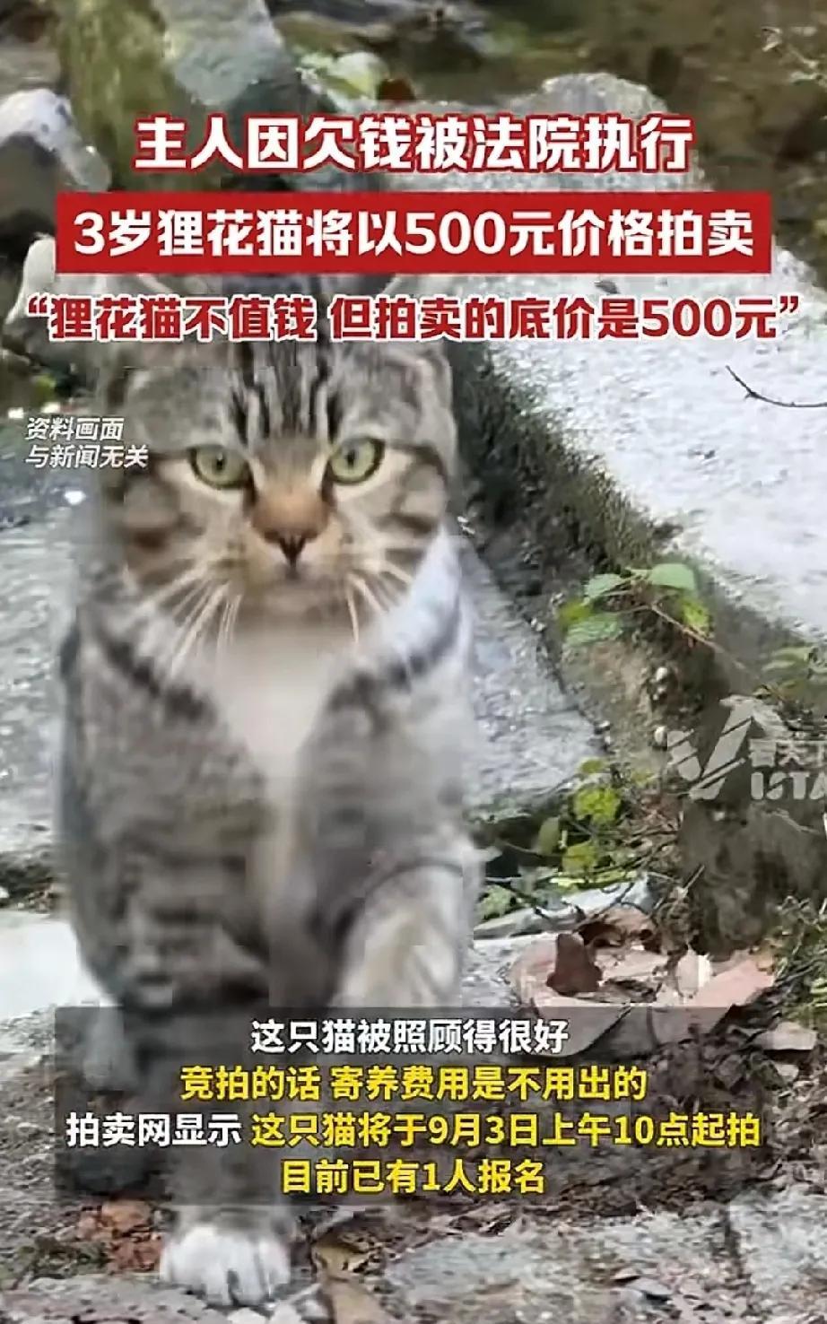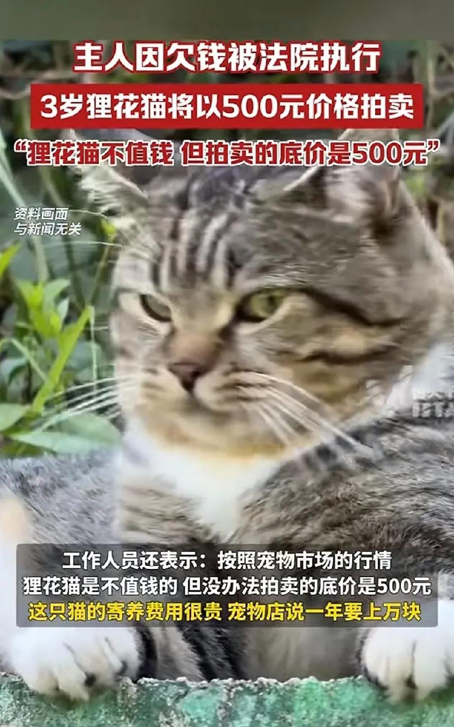史上最悲催的狸花猫,主人欠钱,自己从小被寄养,最后却还要被法院以500元的底价拍卖。 网友说,如此操作着实让人大开眼界,主人欠钱不还,法院竟把宠物猫拿来拍卖抵债。 近日,在杨州一只狸花猫因主人欠钱不还竟被法院强制执行,9月3日将正式以500元的底价公开拍卖,目前已经有多人报名。 据媒体报道,这是扬州经济技术开发区法院的拍卖公告,据说这只狸花猫是因主人欠债才被拍卖的。 该猫咪几个月大时就被它的主人寄养在宠物店,已经寄养三年,每年的寄养费就是上万元,所以必须要拍卖它,如果不拍卖它,寄养费也是非常大的一笔支出,狸花猫不值钱,这500元的拍卖价只是底价而已,竞拍者不用出寄养费。 还是第一次听到这样的消息,多多少少还是让人无法理解,主人欠债怎么累及到宠物呢? 友友们,你们能够理解吗,是不是觉得他们的操作有点让人可笑呢?
