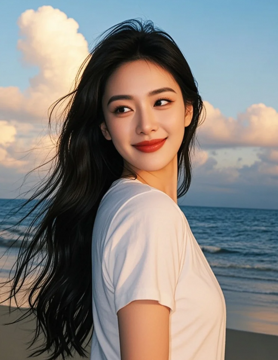 海风掀起她的衣角,发丝如泼墨般在橙红的天幕上挥洒