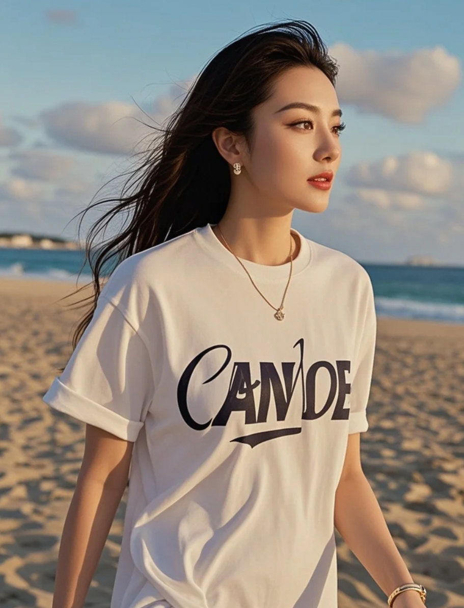 浪花在脚边碎成珍珠,她的发梢沾着细碎的金色阳光