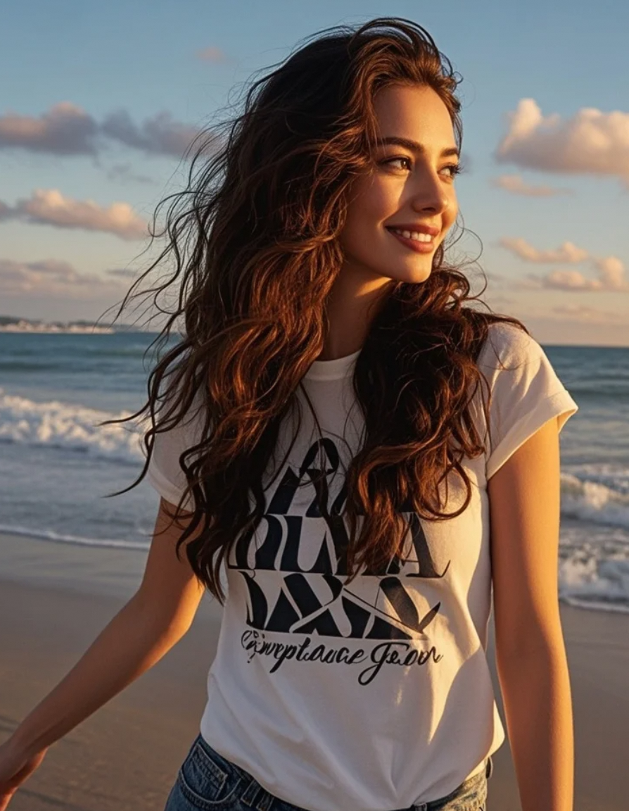 她赤脚踩在沙滩上,发丝随海风飘扬