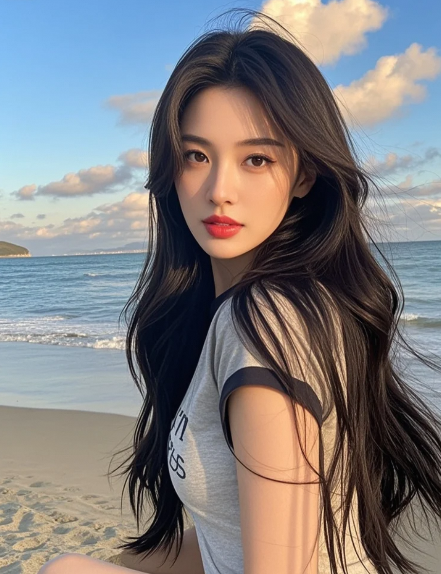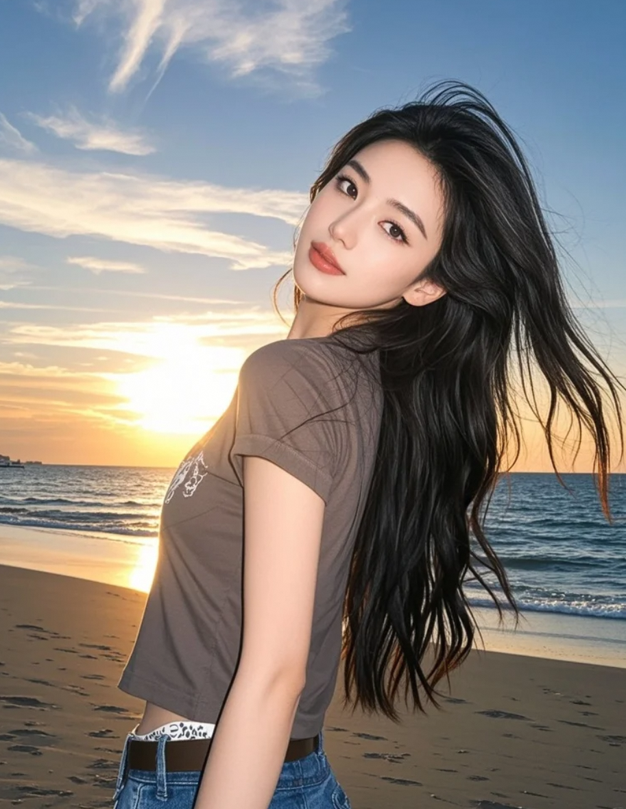 海平线吞没半轮落日时,她的剪影扬起发浪比波涛更汹涌