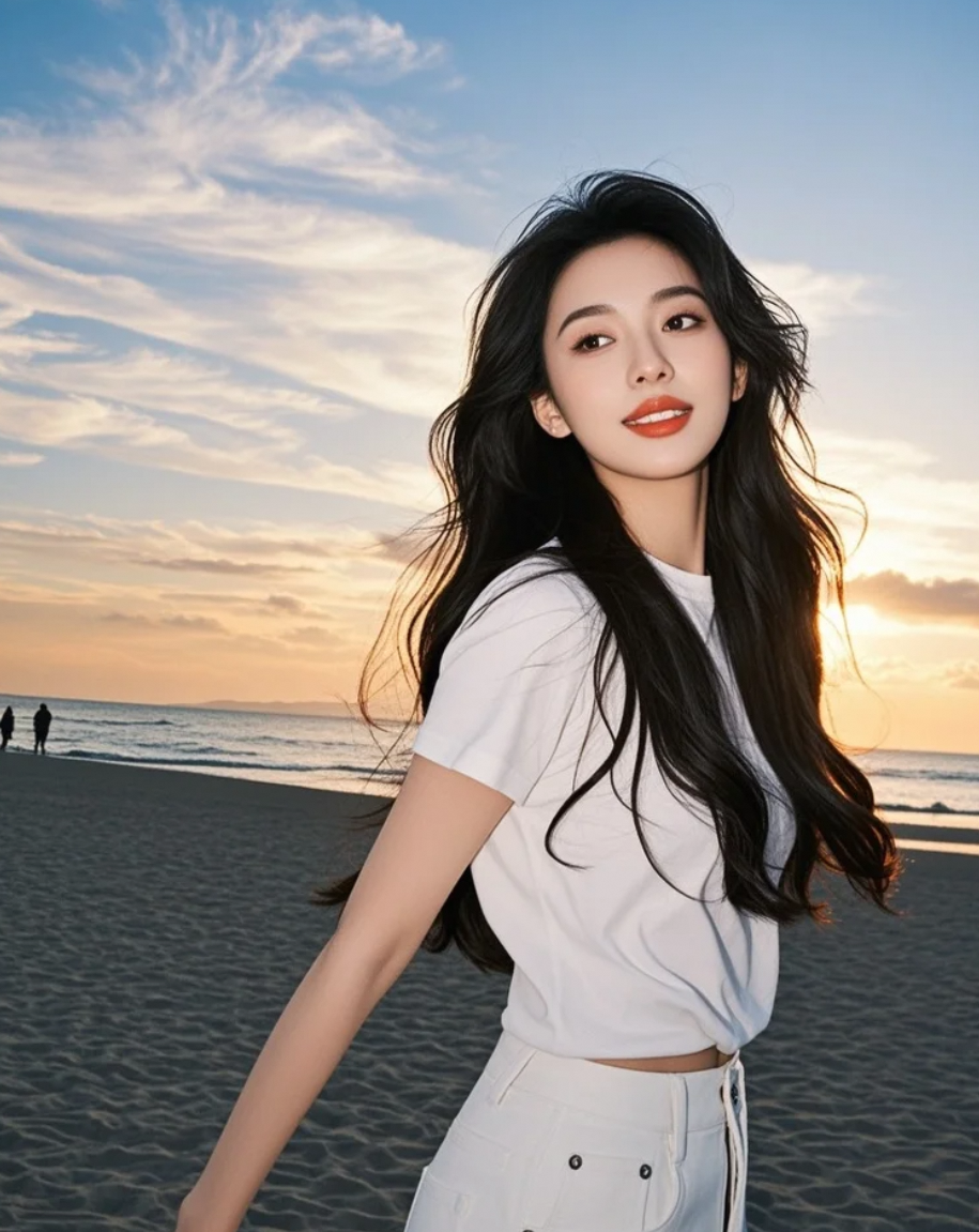 海风掀起她的衣角,发丝如泼墨般在橙红的天幕上挥洒