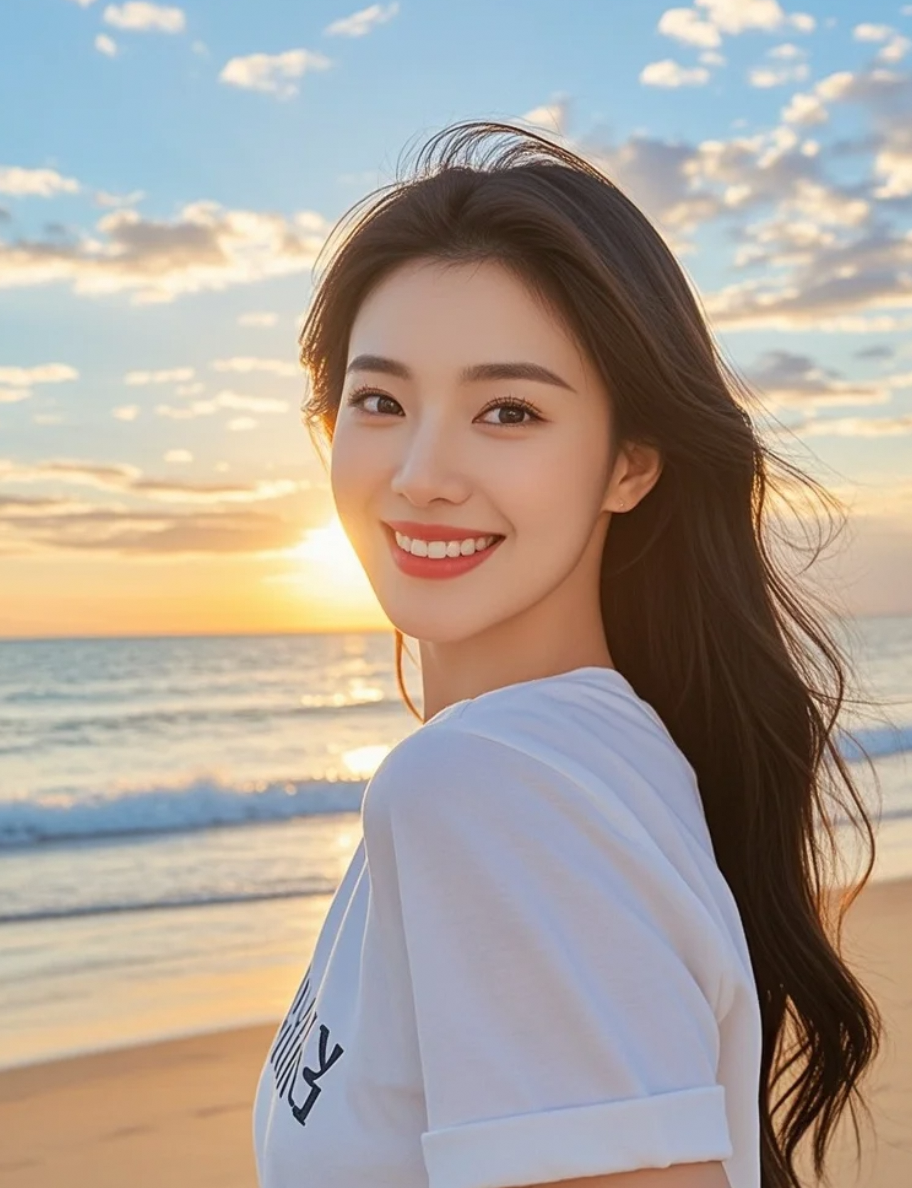 浪花在脚边碎成珍珠,她的发梢沾着细碎的金色阳光