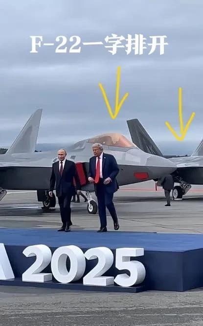特朗普似乎是为在和谈桌上压住普京,竟然在普京头上演了一场相当疯狂的“肌肉展示”。 特朗普在地面普京客机着陆的地面区域内,一字排开F-22"猛禽"隐形战斗机。在普京上台合影时,还有F-35"闪电"II战斗机编队护航的B-2"幽灵"隐形轰炸机! 普京十分配合地抬头,可以看到当时特朗普脸上满意的微笑。事后不少美国媒体解释这是一种【仪式感】,而非通过展示武力来压别人一头。注意,这些飞机飞过普京头顶时可没拉彩色烟雾。