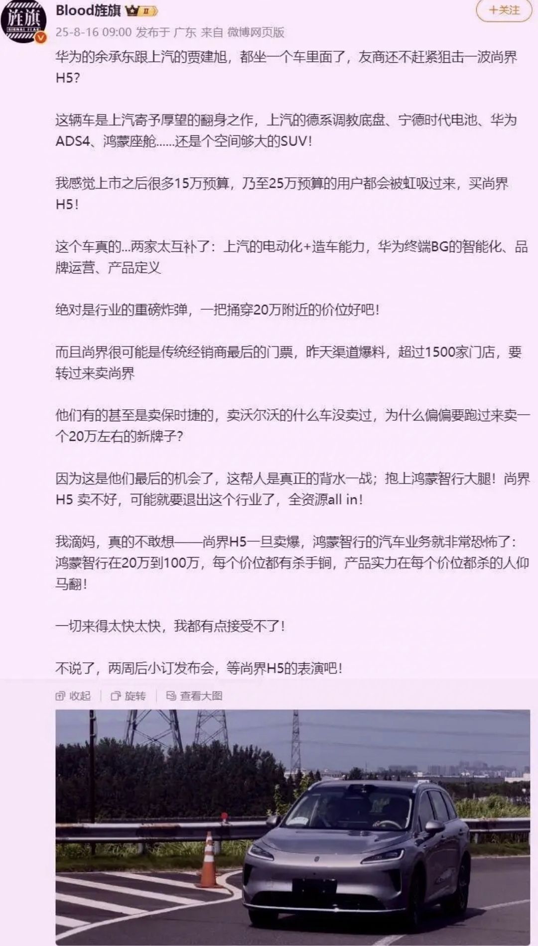 悄悄告诉大家一个内幕!已经确认了,再次强调一下!当余承东坐在尚界H5车内测试后排空间的照片曝光以后!整个汽车市场的心态都炸了,完全就是往友商的心窝子里面扎啊!说白了这款车就是冲着性价比去的,根据目前的消息来看15万左右起步已经是板上钉钉的事实了!本来都知道这是华为和上汽合作推出的新款品牌“尚界”H5,而现在上汽高管贾建旭和余承东坐在H5车内的照片曝光以后,更是八九不离十了!
