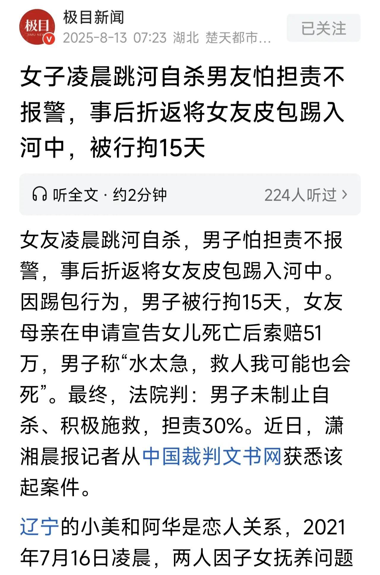 辽宁。一男子凌晨跟女友吵架,女友想不开,夺门而出跳河自杀,男子怕担责不但不报警,事后还折返回去,把女友皮包踢进河中,可男子见死不救,竟只被行拘15天,女友母亲不干了,愤怒的把男子告上法庭,索赔55万,男子却嚣张的说:水那么急,救人我可能也会死。案子经过2审,法院判决意想不到。 8月13日,据极目新闻报道,小美未婚先孕,然后生下孩子。 她本以为男友阿华是个有责任的男人,给她和孩子一个名分,然后承担起为人夫为人父责任,可万万没想到,两人为了孩子的抚养问题争吵不断,感情也消磨殆尽。 2021年7月16日凌晨,两个人大半夜不睡觉,话不投机,因为养儿育女的问题又爆发争吵。 这次,两人情绪都很激动,口不择言,一触即发,特别是小美,她觉得委屈不已,她十月怀胎一朝分娩,为了这个男人,冒着风险生下孩子,可他却这么对她,自己真是遇人不淑,所托非人,一辈子不被这个男人毁了吗? 小美一时想不开,竟然哭着夺门而出跳河自尽了,而这一切发生的太突然,阿华一时没反应过来,等他回过神来,面对湍急的河水。他没勇气跳进去救人,怕把自己搭进去。 阿华眼睁睁看着小美溺水身亡,他冷静后决定不报警,因为他怕被追究责任,赶紧溜之大吉。 离开后,阿华又返了回来,一脚把小美的包踢进河里被水冲走,他这么做,无非是制造小美失足落水的假象,把自己的责任摘的干干净净。 最终,东窗事发,阿华因为踢包行为,被行拘15天,小美的母亲无法原谅阿华的冷酷无情,在她看来如果女儿不是因为和阿华争吵,不可能想不开,女儿走极端,阿华不阻拦不施救,还把包踢河里制造假象,而这样的人,却只受到行拘15天的处罚,她根本接受不了。 小丽母亲在处理完女儿的后事后,2023年8月。去法院申请宣告女儿死亡后,直接向阿华索赔51万,她要给女儿一个交代? 阿华不服气,他一口咬定,不是自己不救,而是水太急了,如果自己贸然施救,不但救不出来小美,还把自己搭进去,自己死了不要紧,孩子谁照顾? 最终,一审法院认为,阿华没制止自杀、积极施救,担责30%,赔偿小美母亲35万。 阿华不服,他一分钱不想掏,认为自己一点责任都没有,他不是不阻止,而是事发突然,一开始没反应过来,小美跳进河里后,他也不是不救,河水那么急,他可能去送死,他这是规避风险,何错之有?又不是他把小美推河里的,而是对方自己跳的。 二审法院可不这么认为,二审认为,阿华和小美是恋人关系,两人吵架,大半夜的小美情绪激动夺门而出,阿华明知她有自杀倾向,而不是把她拉回来,放任她跑到河边跳河。 而且,小美在河水里挣扎,阿华却瞻前顾后,贪生怕死,也不采取措施进行搜救,你不救也行,但是报警呀,可他什么都不做,放任事态恶化,最终为了摆脱责任,竟然还把女友的包裹踢进水里,实在是难逃其咎。 最终,二审驳回上诉,维持原判。 有人说,傻丫头,这种渣男就不配拥有你的真心,你为什么要拿命去赌呢?为什么不及时止损,你这一走,让你父母怎么活呀?你太傻了。 《民法典》第1165条规定:行为人因过错侵害他人民事权益造成损害的,应当承担侵权责任。 根据《民法典》第1165条,阿华需承担侵权责任的关键在于其存在过错且行为与小美的死亡存在因果关系。 恋人之间的特定关系虽非法定救助义务,但本案中,阿华与小美的争吵直接导致小美情绪失控并跳河,其先行行为,激烈争吵可能产生救助义务。 阿华没及时制止小美自杀倾向,争吵后未安抚或阻拦其离开;没履行合理救助义务,如呼救、报警、寻找工具施救;事后销毁证据,踢包入河,加深过错程度。 法院认定阿华的消极行为间接促成小美死亡,责任占比30%,判决赔偿35万元,符合“过错与责任相适应”原则。 《刑法》第14条规定:明知自己的行为会发生危害社会的结果,并且希望或者放任这种结果发生,因而构成犯罪的,是故意犯罪。 阿华是否因未施救和毁灭证据,构成民事侵权或刑事犯罪? 根据《刑法》第14条,故意犯罪需满足“明知且放任结果发生”的主观要件:是否构成不作为的故意杀人?若阿华明知小美自杀可能致死却故意不阻止,可能构成间接故意杀人罪。 但本案中,阿华辩称“水急无法施救”,法院采纳其未积极施救但无杀人故意的主张;司法实践通常以民事侵权处理此类因争吵引发自杀的案件,刑事追责需更高主观恶性证据,如明确教唆自杀行为。 阿华踢包行为违反《治安管理处罚法》,构成故意损毁财物或伪造证据,故被行拘15日。 法院认定阿华对小美自杀存在部分过错,如激化矛盾、不救助,但小美作为成年人需对自身行为承担主要责任70%,因此判赔35万元。 刑事犯罪需严格的主客观要件,而民事侵权更注重行为与结果的因果关系。阿华的行为虽恶劣,但未达刑法追责门槛。 对此,你怎么看? 关注@灋律盐究员 学法辩是非,用法止纷争。