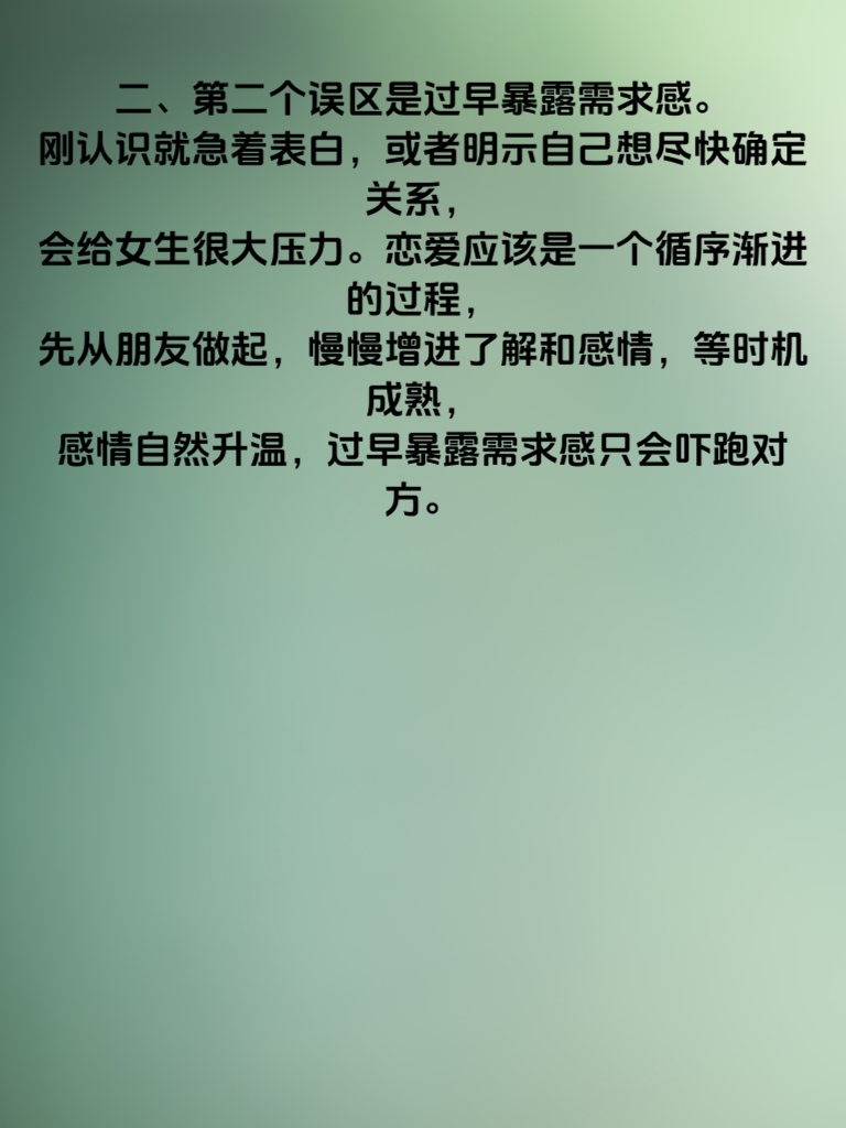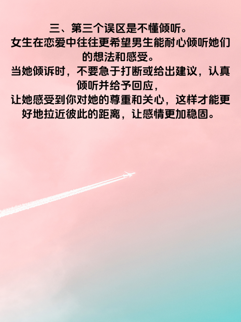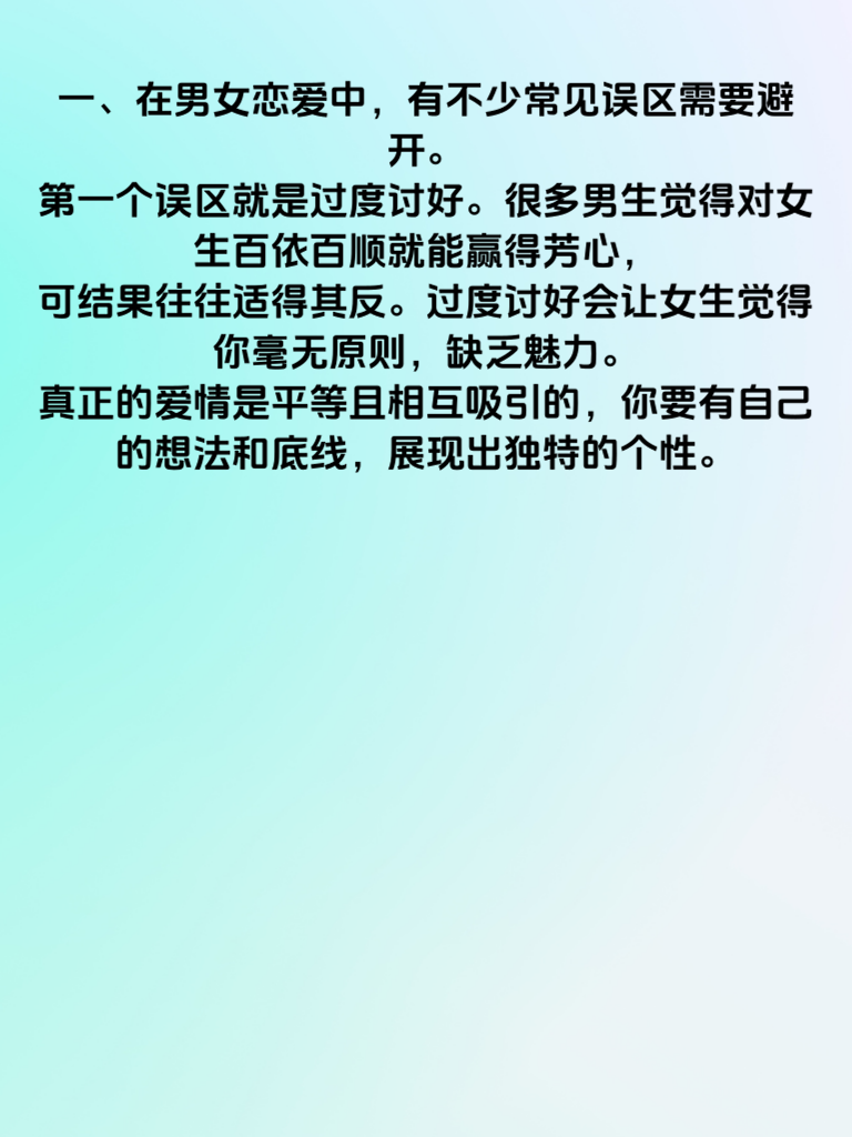 一、在男女恋爱中,有不少常见误区需要避开。第一个误区就是过度讨好。很多男生觉得对女生百依百顺就能赢得芳心,可结果往往适得其反。过度讨好会让女生觉得你毫无原则,缺乏魅力。真正的爱情是平等且相互吸引的,你要有自己的想法和底线,展现出独特的个性。 二、第二个误区是过早暴露需求感。刚认识就急着表白或者明示自己想尽快确定关系,会给女生很大压力。恋爱应该是一个循序渐进的过程,先从朋友做起,慢慢增进了解和感情,等时机成熟,感情自然升温,过早暴露需求感只会吓跑对方。 三、第三个误区是不懂倾听。女生在恋爱中往往更希望男生能耐心倾听她们的想法和感受。当她倾诉时,不要急于打断或给出建议,认真倾听并给予回应,让她感受到你对她的尊重和关心,这样才能更好地拉近彼此的距离,让感情更加稳固。
