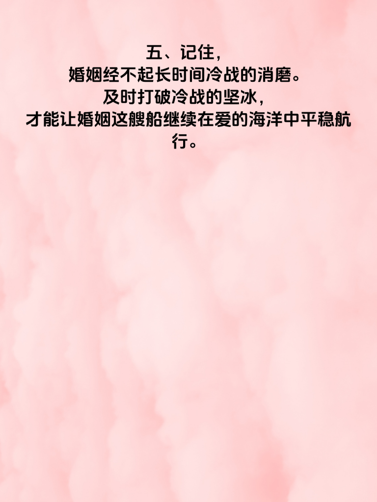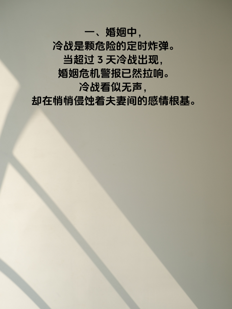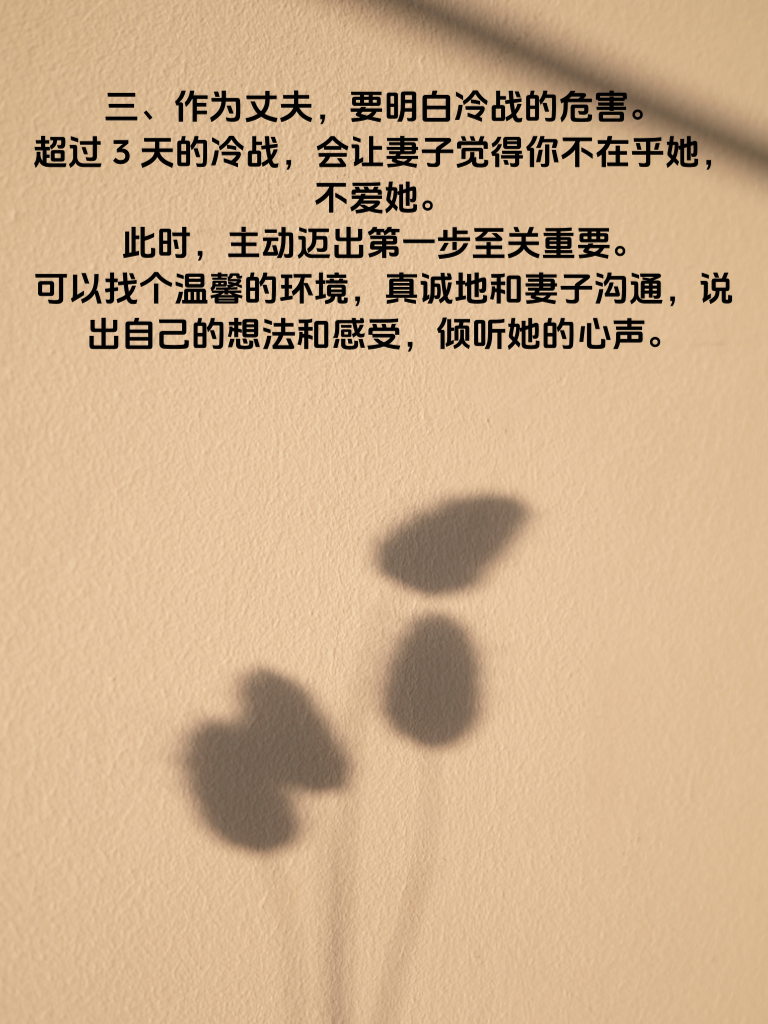 一、婚姻中,冷战是颗危险的定时炸弹。当超过3天冷战出现,婚姻危机警报已然拉响。冷战看似无声,却在悄悄侵蚀着夫妻间的感情根基。 二、女性往往心思细腻,冷战时她们内心的委屈、失望会不断累积。每一次的沉默,都是对情感交流渴望的压抑。她们期待着丈夫能主动打破僵局,给予温暖的回应。 三、作为丈夫,要明白冷战的危害。超过3天的冷战,会让妻子觉得你不在乎她,不爱她。此时,主动迈出第一步至关重要。可以找个温馨的环境,真诚地和妻子沟通,说出自己的想法和感受,倾听她的心声。 四、对于女性而言,不要一味地等待男方主动。自己也可以适时放下身段,用温和的方式开启对话。毕竟婚姻是两个人的事,共同努力才能化解危机,让爱重回正轨。 五、记住,婚姻经不起长时间冷战的消磨。及时打破冷战的坚冰,才能让婚姻这艘船继续在爱的海洋中平稳航行。