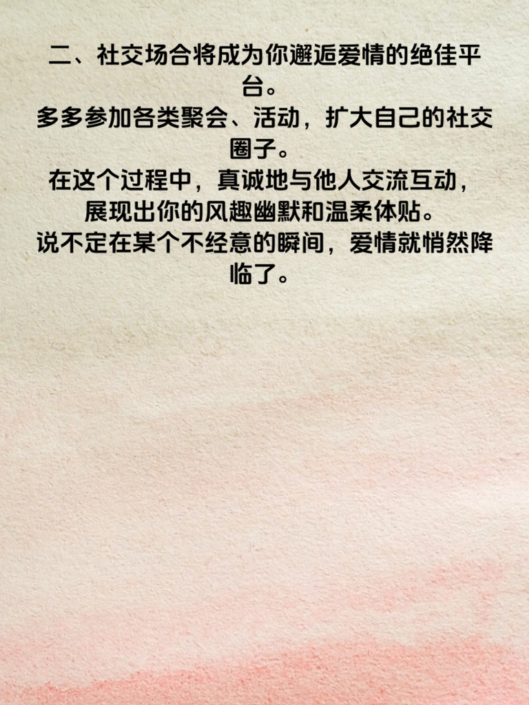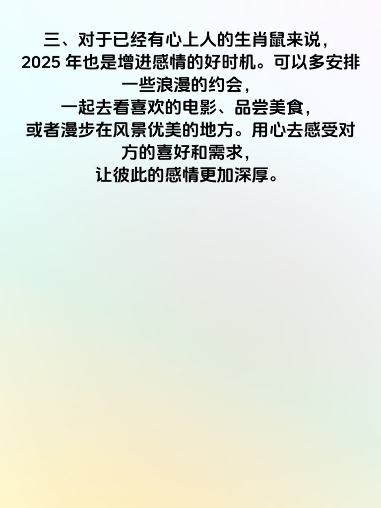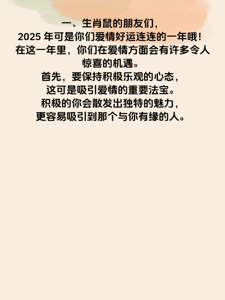 一、生肖鼠的朋友们,2025 年可是你们爱情好运连连的一年哦!在这一年里,你们在爱情方面会有许多令人惊喜的机遇。首先,要保持积极乐观的心态,这可是吸引爱情的重要法宝。积极的你会散发出独特的魅力,更容易吸引到那个与你有缘的人。 二、社交场合将成为你邂逅爱情的绝佳平台。多多参加各类聚会、活动,扩大自己的社交圈子。在这个过程中,真诚地与他人交流互动,展现出你的风趣幽默和温柔体贴。说不定在某个不经意的瞬间,爱情就悄然降临了。 三、对于已经有心上人的生肖鼠来说,2025 年也是增进感情的好时机。可以多安排一些浪漫的约会,一起去看喜欢的电影、品尝美食,或者漫步在风景优美的地方。用心去感受对方的喜好和需求,让彼此的感情更加深厚。 四、记住,爱情需要耐心和细心去经营。在 2025 年,只要你用心把握每一个机会,用真诚去对待爱情,相信你一定能收获满满的爱情好运,找到属于自己的幸福甜蜜。