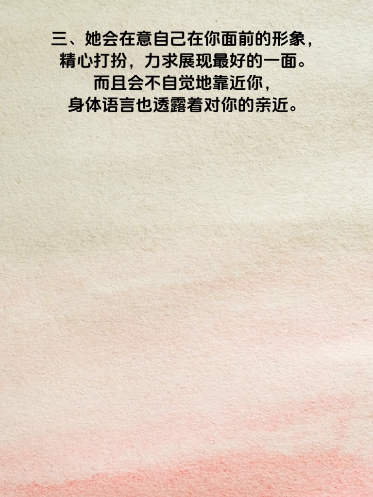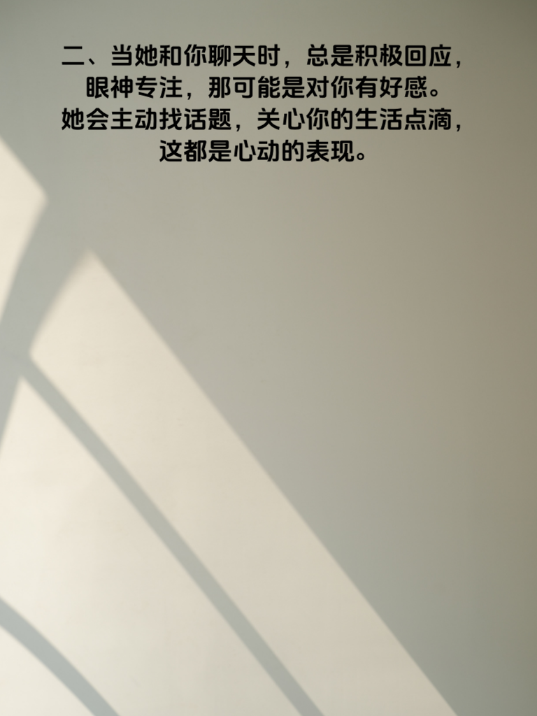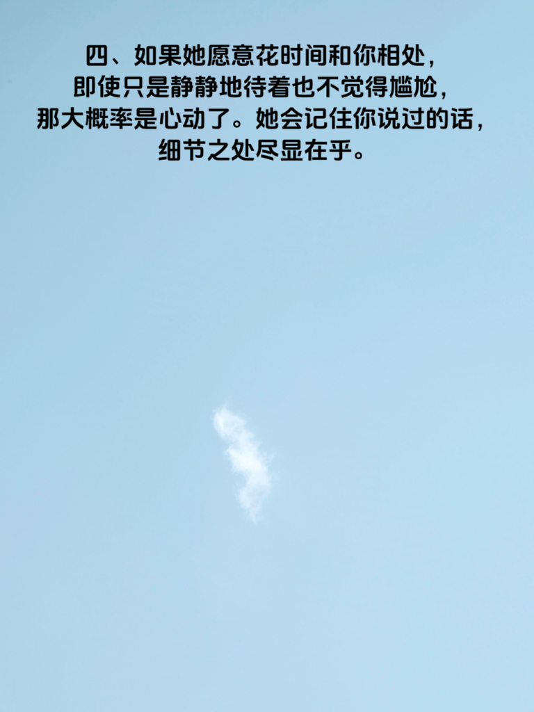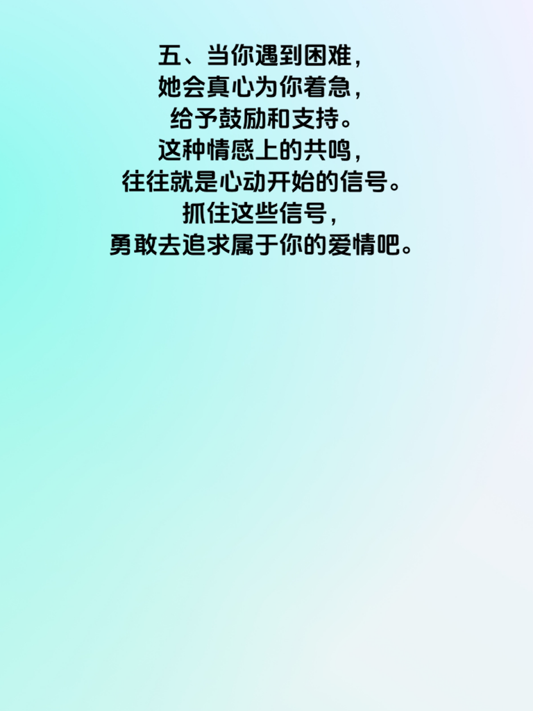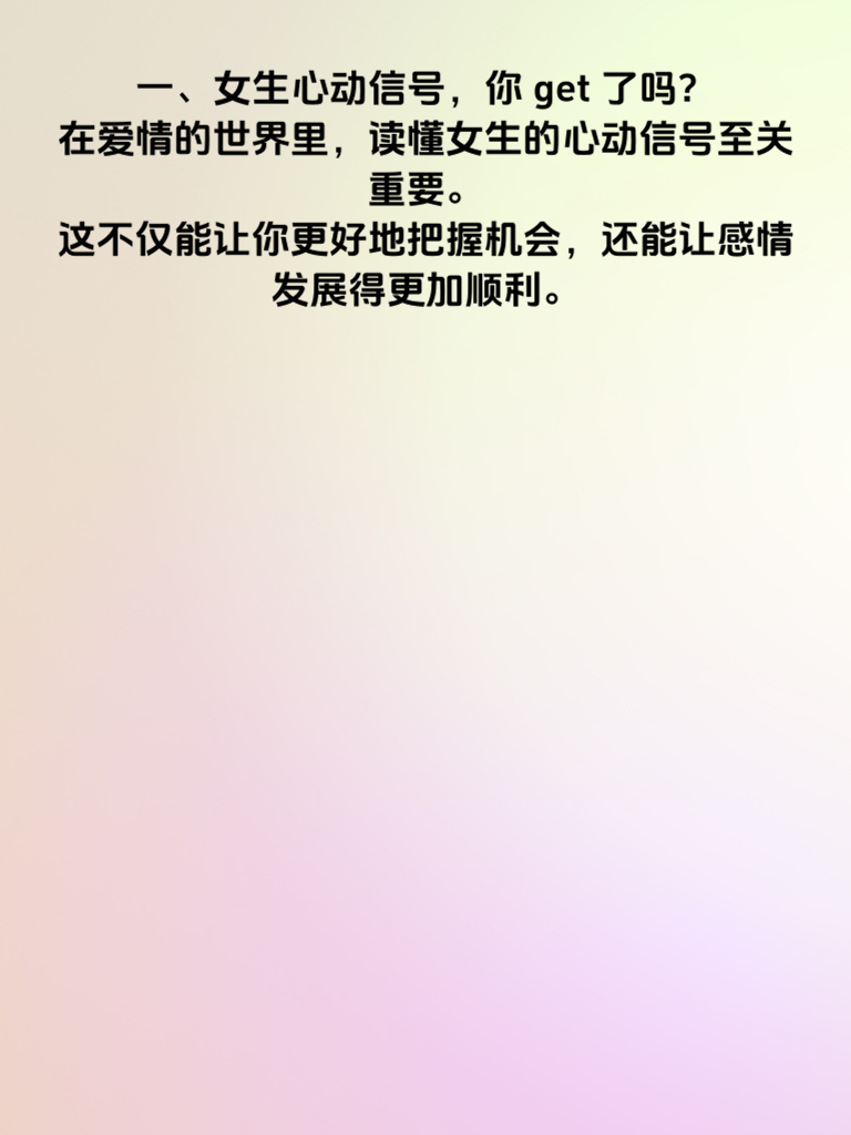 一、女生心动信号,你get了吗?在爱情的世界里,读懂女生的心动信号至关重要。这不仅能让你更好地把握机会,还能让感情发展得更加顺利。 二、当她和你聊天时,总是积极回应,眼神专注,那可能是对你有好感。她会主动找话题,关心你的生活点滴,这都是心动的表现。 三、她会在意自己在你面前的形象,精心打扮,力求展现最好的一面。而且会不自觉地靠近你,身体语言也透露着对你的亲近。 四、如果她愿意花时间和你相处,即使只是静静地待着也不觉得尴尬,那大概率是心动了。她会记住你说过的话,细节之处尽显在乎。 五、当你遇到困难,她会真心为你着急,给予鼓励和支持。这种情感上的共鸣,往往就是心动开始的信号。抓住这些信号,勇敢去追求属于你的爱情吧。