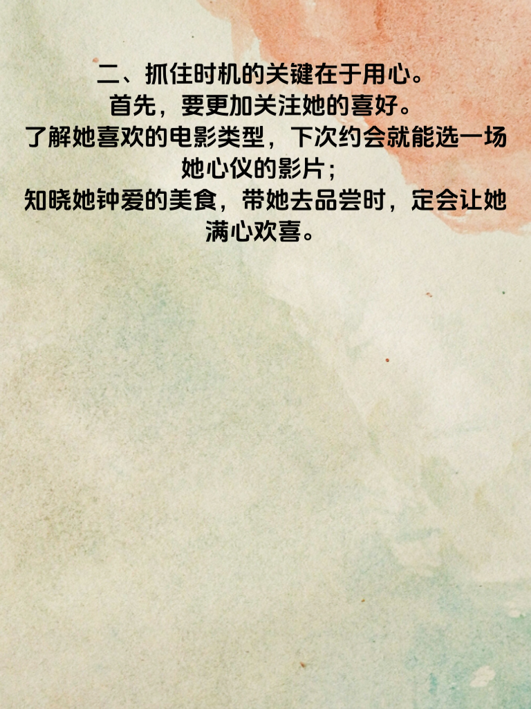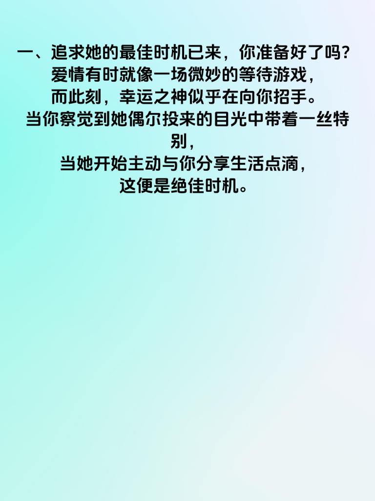 一、追求她的最佳时机已来,你准备好了吗?爱情有时就像一场微妙的等待游戏,而此刻,幸运之神似乎在向你招手。当你察觉到她偶尔投来的目光中带着一丝特别,当她开始主动与你分享生活点滴,这便是绝佳时机。 二、抓住时机的关键在于用心。首先,要更加关注她的喜好。了解她喜欢的电影类型,下次约会就能选一场她心仪的影片;知晓她钟爱的美食,带她去品尝时,定会让她满心欢喜。 三、沟通也至关重要。用真诚的态度与她交流,倾听她的想法和梦想。在她倾诉时,专注地看着她,适时给予回应。让她感受到你对她内心世界的尊重与珍视。 四、行动更是必不可少。在她需要帮助时及时出现,无论是工作上的难题还是生活中的琐事。小小的举动,能在她心中种下温暖的种子。 五、记住,这个时机稍纵即逝。勇敢地迈出第一步,用你的热情与真心去追求她。相信在这个美好的时刻,你能收获一份属于自己的甜蜜爱情。