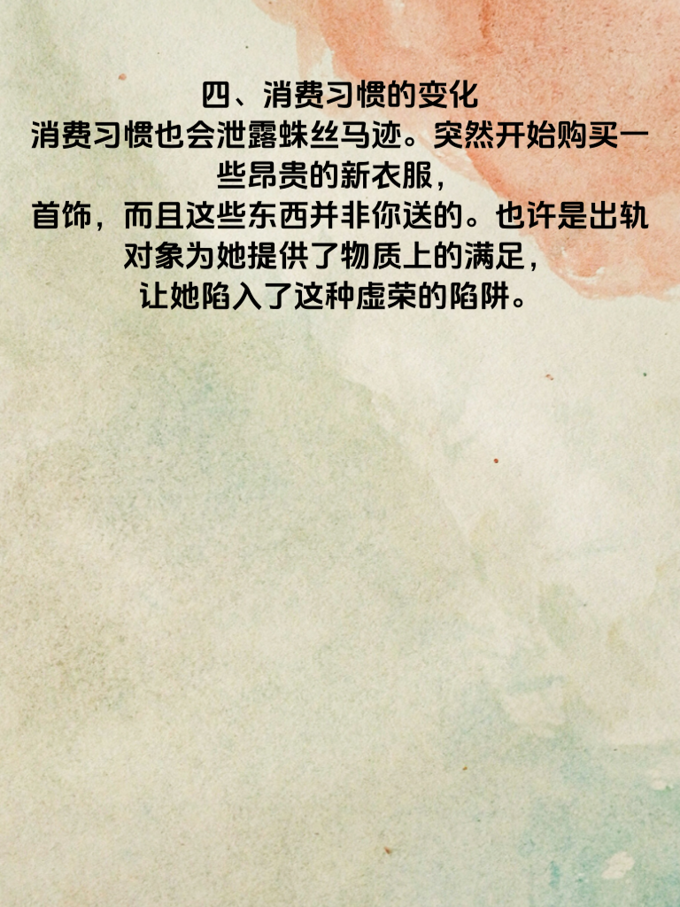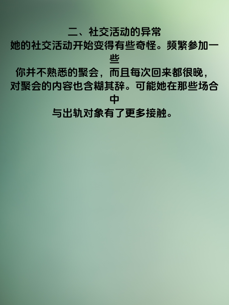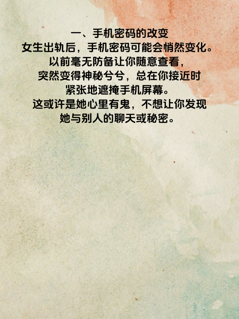 一、手机密码的改变\n女生出轨后,手机密码可能会悄然变化。以前毫无防备让你随意查看,突然变得神秘兮兮,总在你接近时紧张地遮掩手机屏幕。这或许是她心里有鬼,不想让你发现她与别人的聊天或秘密。 二、社交活动的异常\n她的社交活动开始变得有些奇怪。频繁参加一些你并不熟悉的聚会,而且每次回来都很晚,对聚会的内容也含糊其辞。可能她在那些场合中与出轨对象有了更多接触。 三、对你态度的转变\n态度上也会有明显不同。不再像以前那样温柔体贴,对你的关心和付出变得冷漠,甚至经常无故发脾气。这背后可能是她内心的纠结,觉得对你有了愧疚,又难以割舍外面的感情。 四、消费习惯的变化\n消费习惯也会泄露蛛丝马迹。突然开始购买一些昂贵的新衣服、首饰,而且这些东西并非你送的。也许是出轨对象为她提供了物质上的满足,让她陷入了这种虚荣的陷阱。