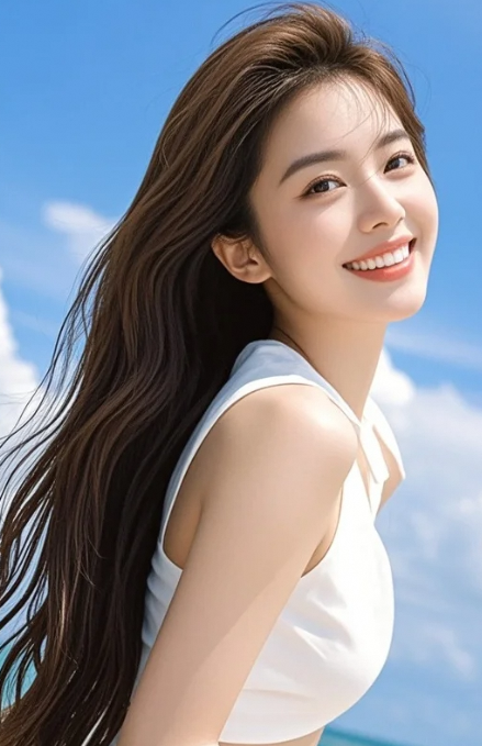 浪花在脚边碎成珍珠,她的发梢沾着细碎的金色阳光