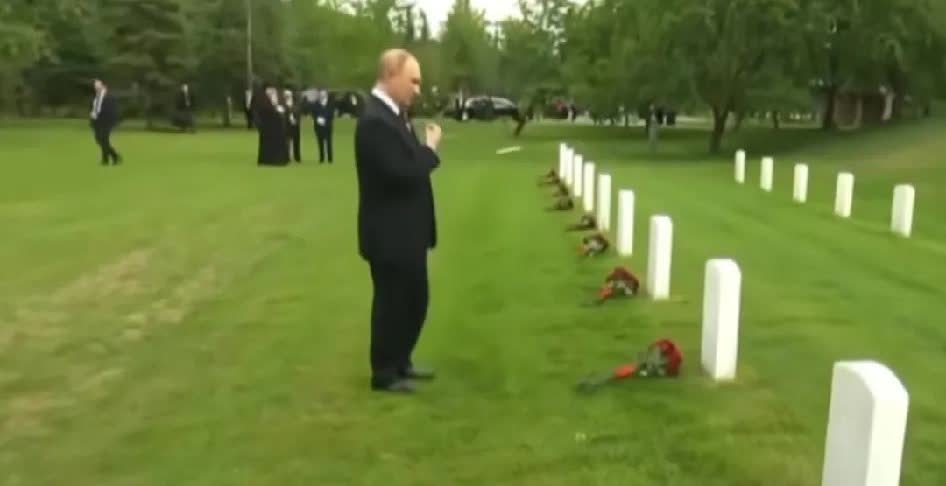 会晤后普京向阿拉斯加州苏联飞行员墓献花,发现普京走的草坪路有引路的先走过的痕迹!